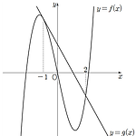 그림과 같이 원점에 대하여 대칭인 삼차함수 \(y=f(x)\) 의 그래프와 일차함수 \(y=g(x)\) 의 그래프가 \(x=-1\) 에서 접하고 \(x=2\) 에서 만난다. \(g(0)=2\) 이고 \(g(2)