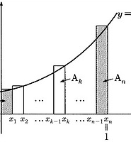 함수 \(f(x)=x^2\) 에 대하여 그림과 같이 구간 \([0,\;1]\) 을 \(2n\) 등분한 후, 구간 \(\left [ \dfrac{k-1}{2n},\; \dfrac{k}{2n} \right ] \) 을 밑변으로 하고 높이가 \(f \left ( \dfrac{k}{2n}\right ) \) 인 직사각형의 넓이를 \(S_k\) 라 하자.