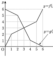 집합 $A=\{1, \;2, \;3, \;4, \;5\}$ 에 대하여 집합 $A$ 에서 집합 $A$ 로의 함수 $f(x), \; g(x)$ 가 있다. 두 함수 $y=f(x), \; y=(f \circ g)(x)$ 의 그래프가 각각 그림과 같을 때, $g(2)+(g \circ f)^{-1}(1)$의 값은?