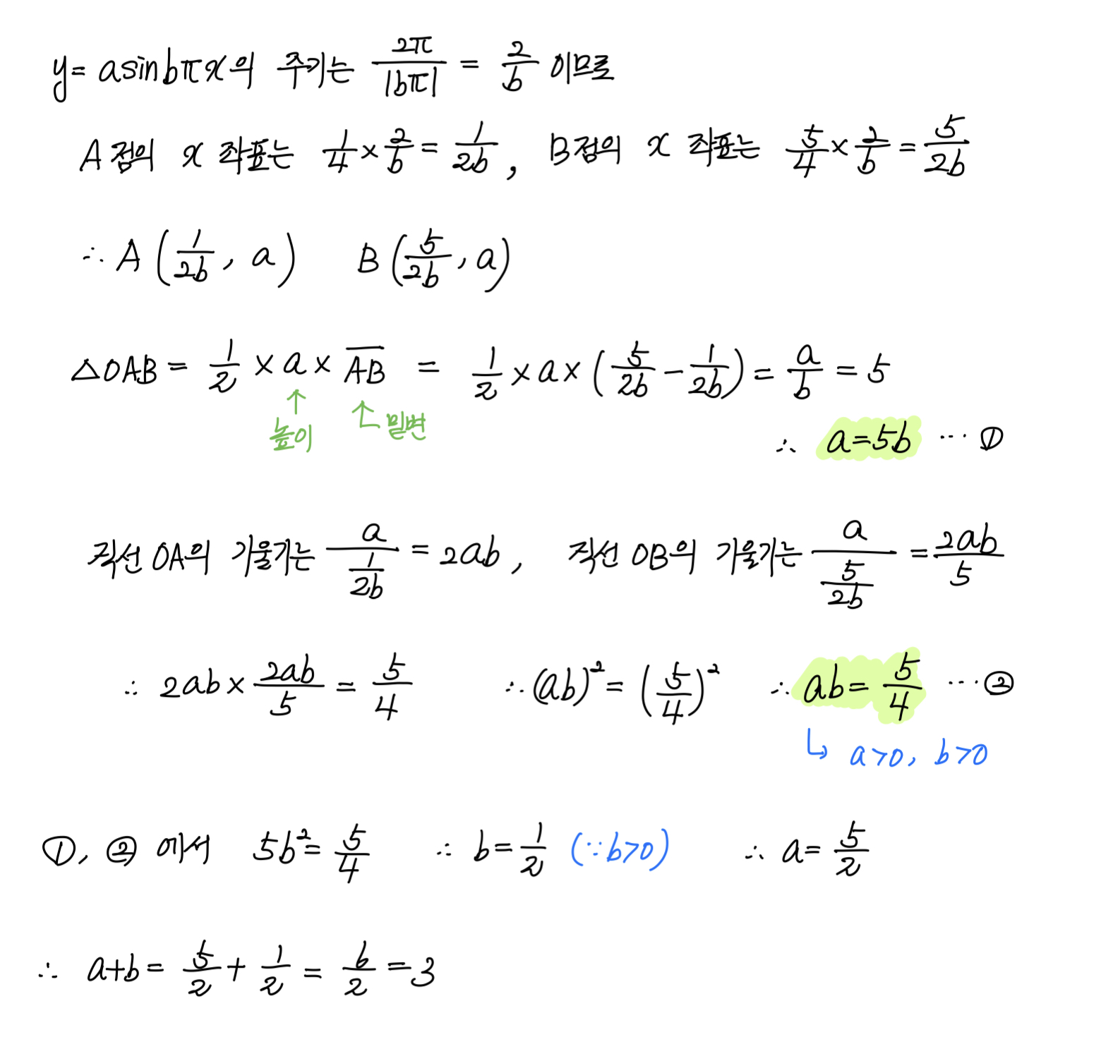 두 양수 $a, \; b$ 에 대하여 곡선 $y=a \sin b \pi x \; \left ( 0 \le x \le \dfrac{3}{b} \right )$ 이 직선 $y=a$ 와 만나는 서로 다른 두 점을 $\rm A, \; B$ 라 하자. 삼각형 $\rm OAB$ 이 넓이가 $5$ 이고 직선 $\rm OA$ 의 기울기와 직선 $\rm OB$ 의 기울기의 곱이 $\dfrac{5}{4}$ 일 때, $a+b$ 의 값은? (단, $\rm O$ 는 원점이다.)