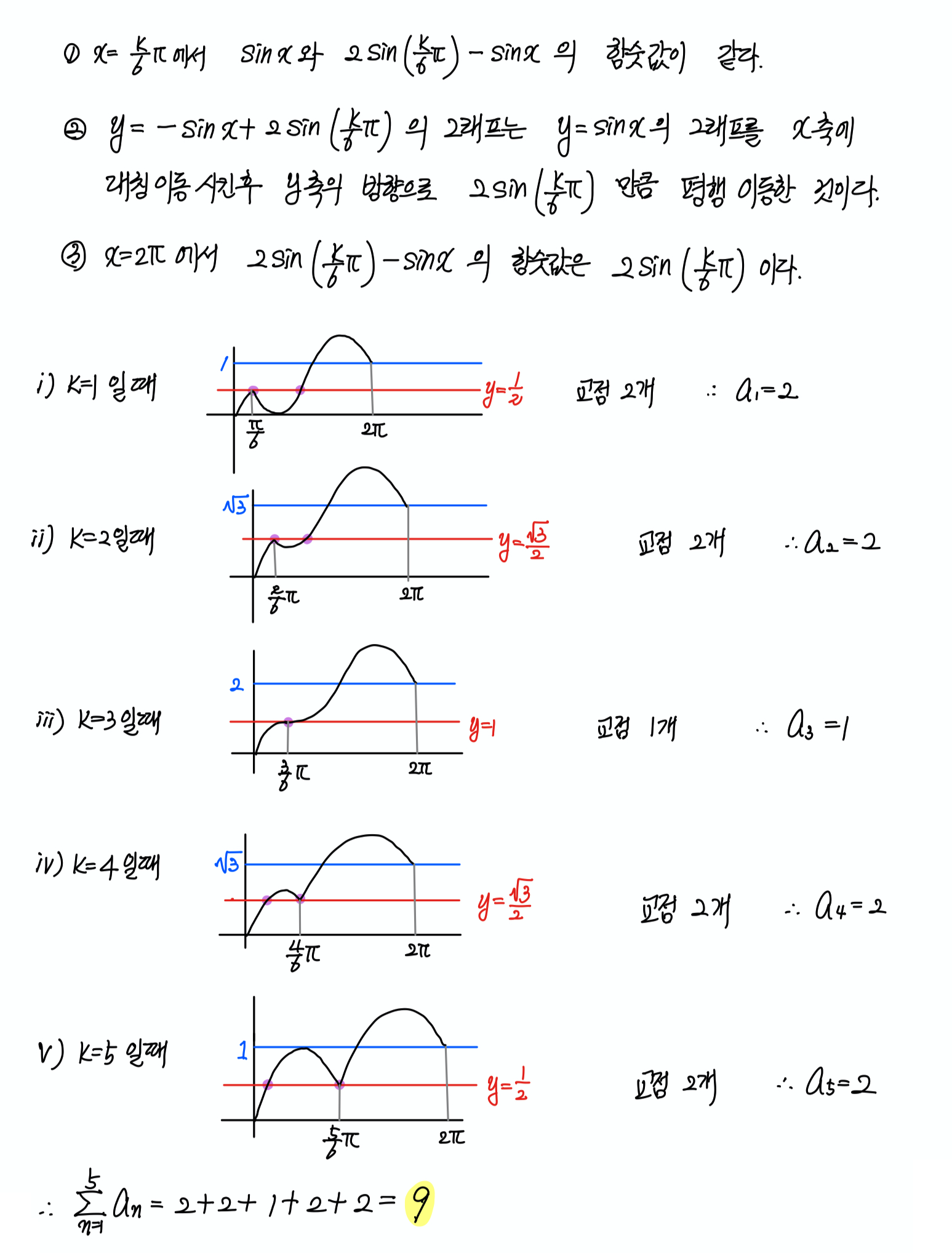 닫힌구간 $[0, \; 2\pi]$ 에서 정의된 함수 $f(x)$ 는 $$f(x)=\begin{cases} \sin x & \left (0 \le x \le \dfrac{k}{6}\pi \right ) \\[10pt] 2 \sin \left (\dfrac{k}{6}\pi \right ) - \sin x & \left ( \dfrac{k}{6}\pi < x \le 2\pi \right ) \end{cases}$$ 이다. 곡선 $y=f(x)$ 와 직선 $y=\sin \left (\dfrac{k}{6}\pi \right )$ 의 교점의 개수를 $a_k$ 라 할 때, $a_1 + a_2 + a_3 + a_4 + a_5$ 의 값은?