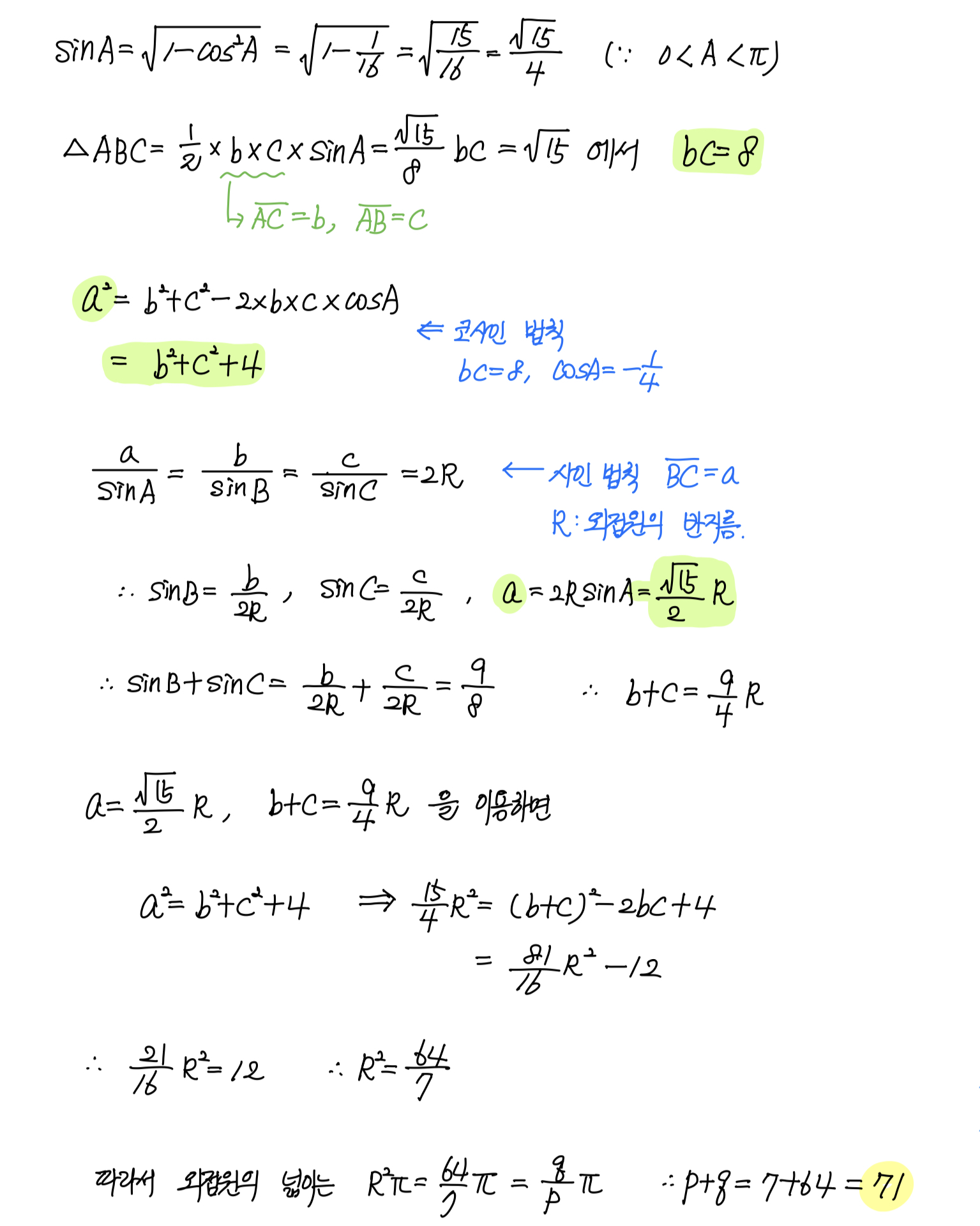사인법칙&코사인법칙_난이도 중상 (2021년 11월 전국연합 고2 29번) 본문