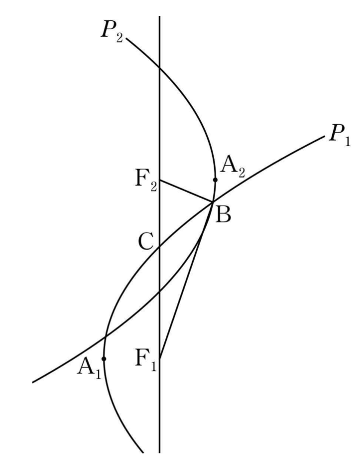 두 포물선 $P_1, \; P_2$가 서로 다른 두 점에서 만날 때 두 점 중에서 점 $\rm A_2$에 가까운 점을 $\rm B$라 하자. 포물선 $P_1$이 선분 $\rm F_1F_2$와 만나는 점을 $\rm C$라 할 때, 두 점 $\rm B, \; C$가 다음 조건을 만족시킨다.