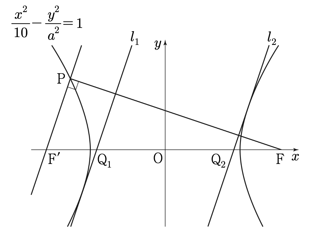 그림과 같이 두 점 $\rm F(c, \; 0), \; F'(-c, \; 0)\; (c>0)$을 초점으로 하는 쌍곡선 $\dfrac{x^2}{10}-\dfrac{y^2}{a^2}=1$이 있다. 쌍곡선 위의 점 중 제2사분면에 있는 점 $\rm P$에 대하여 삼각형 $\rm F'FP$는 넓이가 $15$이고 $\angle \rm F'PF=\dfrac{\pi}{2}$인 직각삼각형이다. 직선 $\rm PF'$과 평행하고 쌍곡선에 접하는 두 직선을 각각 $l_1, \; l_2$라 하자. 두 직선 $l_1, \; l_2$가 $x$축과 만나는 점을 각각 $\rm Q_1, \; Q_2$라 할 때, $\overline{\rm Q_1Q_2}=\dfrac{q}{p}\sqrt{3}$이다. $p+q$의 값을 구하시오. (단, $p$와 $q$는 서로소인 자연수이고, $a$는 양수이다.)