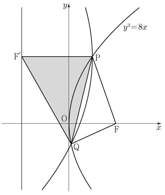 초점이 $\rm F$ 인 포물선 $y^2=8x$ 위의 점 중 제$1$사분면에 있는 점 $\rm P$ 를 지나고 $x$ 축과 평행한 직선이 포물선 $y^2=8x$ 의 준선과 만나는 점을 $\rm F'$ 라 하자. 점 $\rm F'$ 을 초점, 점 $\rm P$ 를 꼭짓점으로 하는 포물선이 포물선 $y^2=8x$ 와 만나는 점 중 $\rm P$ 가 아닌 점을 $\rm Q$ 라 하자. 사각형 $\rm PF'QF$ 의 둘레의 길이가 $12$ 일 때, 삼각형 $\rm PF'Q$ 의 넓이는 $\dfrac{q}{p}\sqrt{2}$ 이다. $p+q$ 의 값을 구하시오. (단, $\rm P$ 의 $x$ 좌표는 $2$ 보다 작고, $p$ 와 $q$ 는 서로소인 자연수이다.)