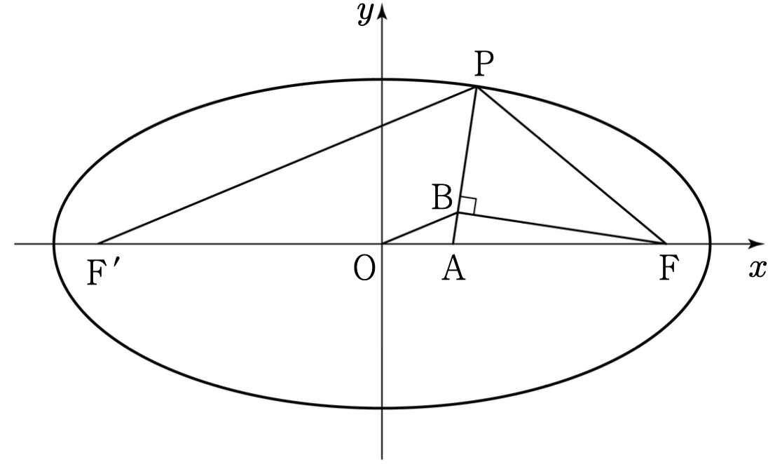 그림과 같이 ${\rm F}(6, \; 0), \; {\rm F'}(-6, \; 0)$ 을 두 초점으로 하는 타원 $\dfrac{x^2}{a^2}+\dfrac{y^2}{b^2}=1$ 이 있다. 점 ${\rm A} \left (\dfrac{3}{2}, \; 0 \right )$ 에 대하여 $\angle {\rm FPA} = \angle {\rm F'PA}$ 를 만족시키는 타원의 제$1$사분면 위의 점을 $\rm P$ 라 할 때, 점 $\rm F$ 에서 직선 $\rm AP$ 에 내린 수선의 발을 $\rm B$ 라 하자. $\overline{\rm OB}=\sqrt{3}$ 일 때, $a \times b$ 의 값은? (단, $a>0, \; b>0$ 이고 $\rm O$ 는 원점이다.)