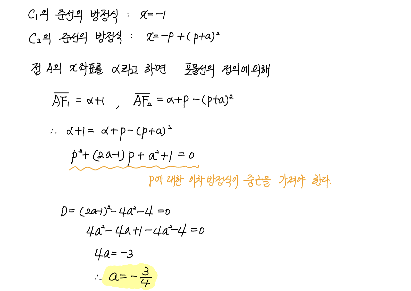 실수 $p \; (p \ge 1)$ 과 함수 $f(x)=(x+a)^2$ 에 대하여 두 포물선 $$C_1 : y^2=4x, \quad C_2 : (y-3)^2=4p\{x-f(p)\}$$ 가 제$1$사분면에서 만나는 점을 $\rm A$ 라 하자. 두 포물선 $C_1, \; C_2$ 의 초점을 각각 $\rm F_1, \; F_2$ 라 할 때, $\overline{\rm AF_1}=\overline{\rm AF_2}$ 를 만족시키는 $p$ 가 오직 하나가 되도록 하는 상수 $a$ 의 값은?