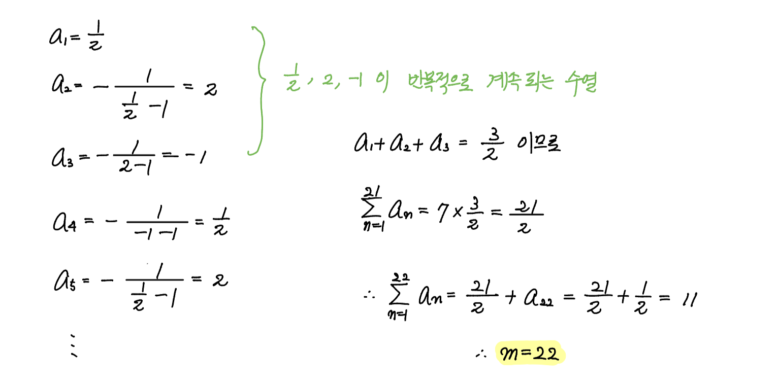 첫째항이 $\dfrac{1}{2}$ 인 수열 $\{a_n\}$ 이 모든 자연수 $n$ 에 대하여 $$a_{n+1} = -\dfrac{1}{a_n-1}$$ 을 만족시킨다. 수열 $\{a_n\}$ 의 첫째항부터 제$n$항까지의 합을 $S_n$ 이라 할 때, $S_m=11$ 을 만족시키는 자연수 $m$ 의 값은?