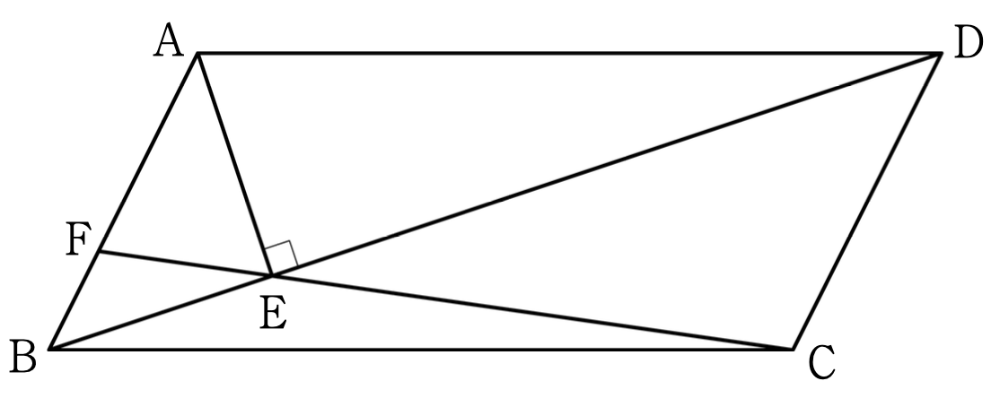 그림과 같이 평행사변형 $\mathrm{ABCD}$ 가 있다. 점 $\mathrm{A}$ 에서 선분 $\mathrm{BD}$ 에 내린 수선의 발을 $\mathrm{E}$ 라 하고, 직선 $\mathrm{CE}$ 가 선분 $\mathrm{AB}$ 와 만나는 점을 $\mathrm{F}$ 라 하자.