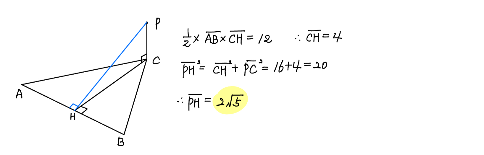 평면 $\alpha$ 위에 $\overline{\mathrm{AB}}=6$ 이고 넓이가 $12$ 인 삼각형 $\mathrm{ABC}$ 가 있다. 평면 $\alpha$ 위에 있지 않은 점 $\mathrm{P}$ 에서 평면 $\alpha$ 에 내린 수선의 발이 점 $\mathrm{C}$ 와 일치한다. $\overline{\mathrm{PC}}=2$ 일 때, 점 $\mathrm{P}$ 와 직선 $\mathrm{AB}$ 사이의 거리는?