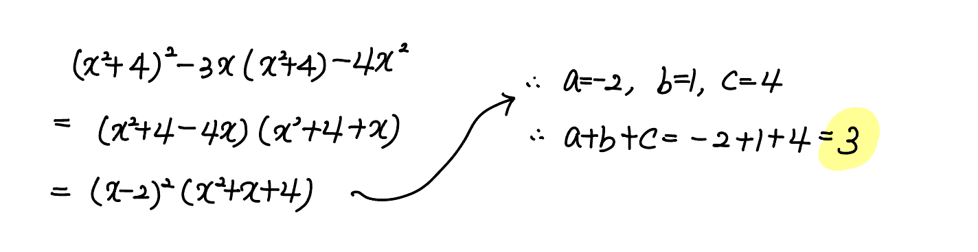 다항식 $\left (x^2+4 \right )^2 - 3x \left (x^2+4 \right ) -4x^2$ 이 $(x+a)^2 \left (x^2+bx+c \right )$ 로 인수분해될 때, 세 정수 $a, \; b, \; c$ 에 대하여 $a+b+c$ 의 값은?