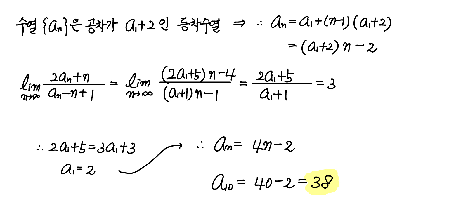 수열 $\{a_n\}$ 이 모든 자연수 $n$ 에 대하여 $$a_{n+1}-a_n = a_1 +2$$ 를 만족시킨다. $\lim \limits_{n \to \infty}\dfrac{2a_n+n}{a_n -n +1}=3$ 일 때, $a_{10}$ 의 값은? (단, $a_1 >0$)