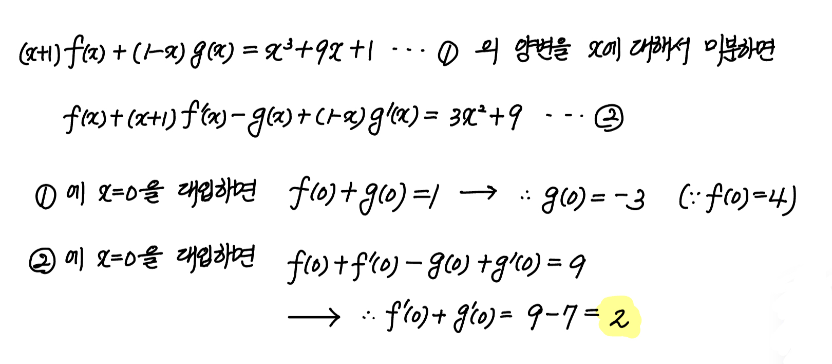 두 다항함수 $f(x), \; g(x)$ 에 대하여 $$(x+1)f(x)+(1-x)g(x)=x^3+9x+1, \quad f(0)=4$$ 일 때, $f'(0)+g'(0)$ 의 값은?