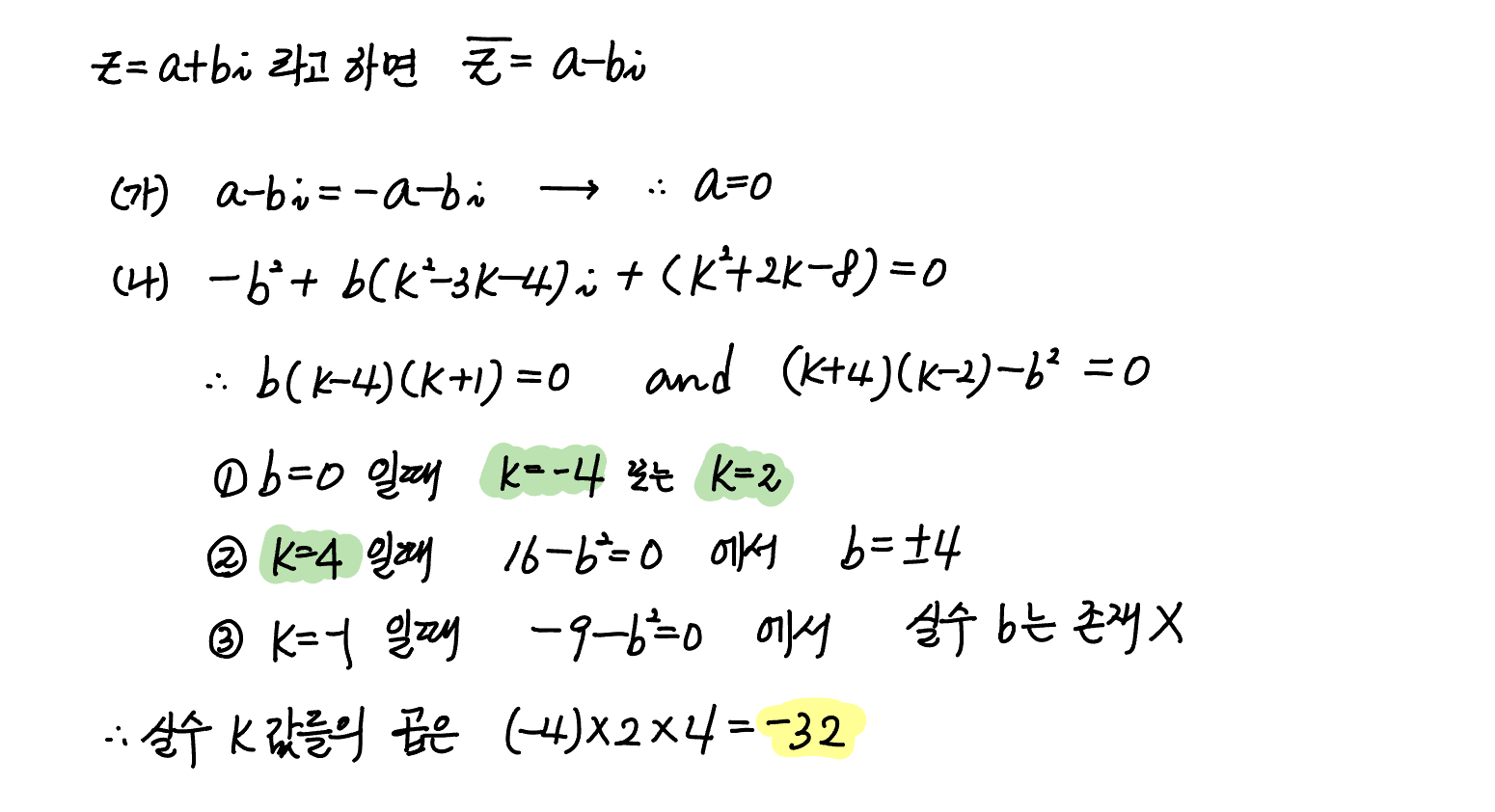 (나) $z^2+ \left (k^2-3k-4 \right )z+\left (k^2+2k-8 \right )=0$