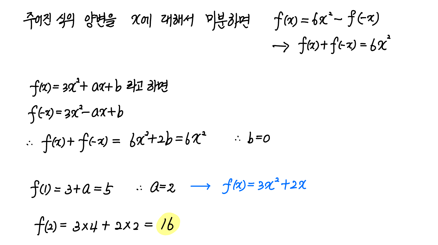 최고차항의 계수가 $3$ 인 이차함수 $f(x)$ 가 모든 실수 $x$ 에 대하여 $$\displaystyle \int_0^x f(t)dt = 2x^3 + \int_0^{-x} f(t)dt$$ 를 만족시킨다. $f(1)=5$ 일 때, $f(2)$ 의 값을 구하시오.