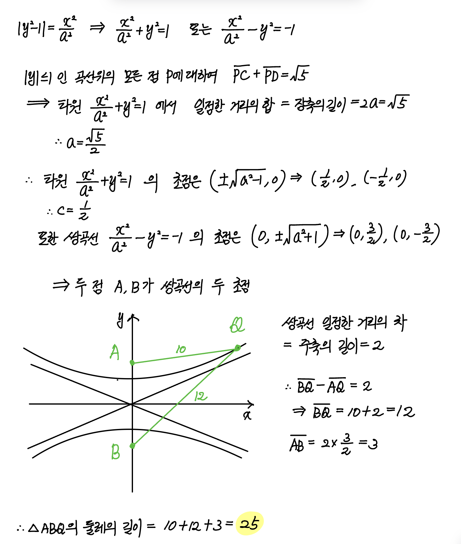 좌표평면에 곡선 $\left |y^2-1 \right | = \dfrac{x^2}{a^2}$ 과 네 점 $\mathrm{A}(0, \; c+1)$, $\mathrm{B}(0, \; -c-1), \; \mathrm{C}(c, \; 0)$, $\mathrm{D}(-c, \; 0)$ 이 있다. 곡선 위의 점 중 $y$ 좌표의 절댓값이 $1$ 보다 작거나 같은 모든 점 $\mathrm{P}$ 에 대하여 $\overline{\mathrm{PC}}+\overline{\mathrm{PD}}=\sqrt{5}$ 이다. 곡선 위의 점 $\mathrm{Q}$ 가 제$1$사분면에 있고 $\overline{\mathrm{AQ}}=10$ 일 때, 삼각형 $\mathrm{ABQ}$ 의 둘레의 길이를 구하시오. (단, $a$ 와 $c$ 는 양수이다.)