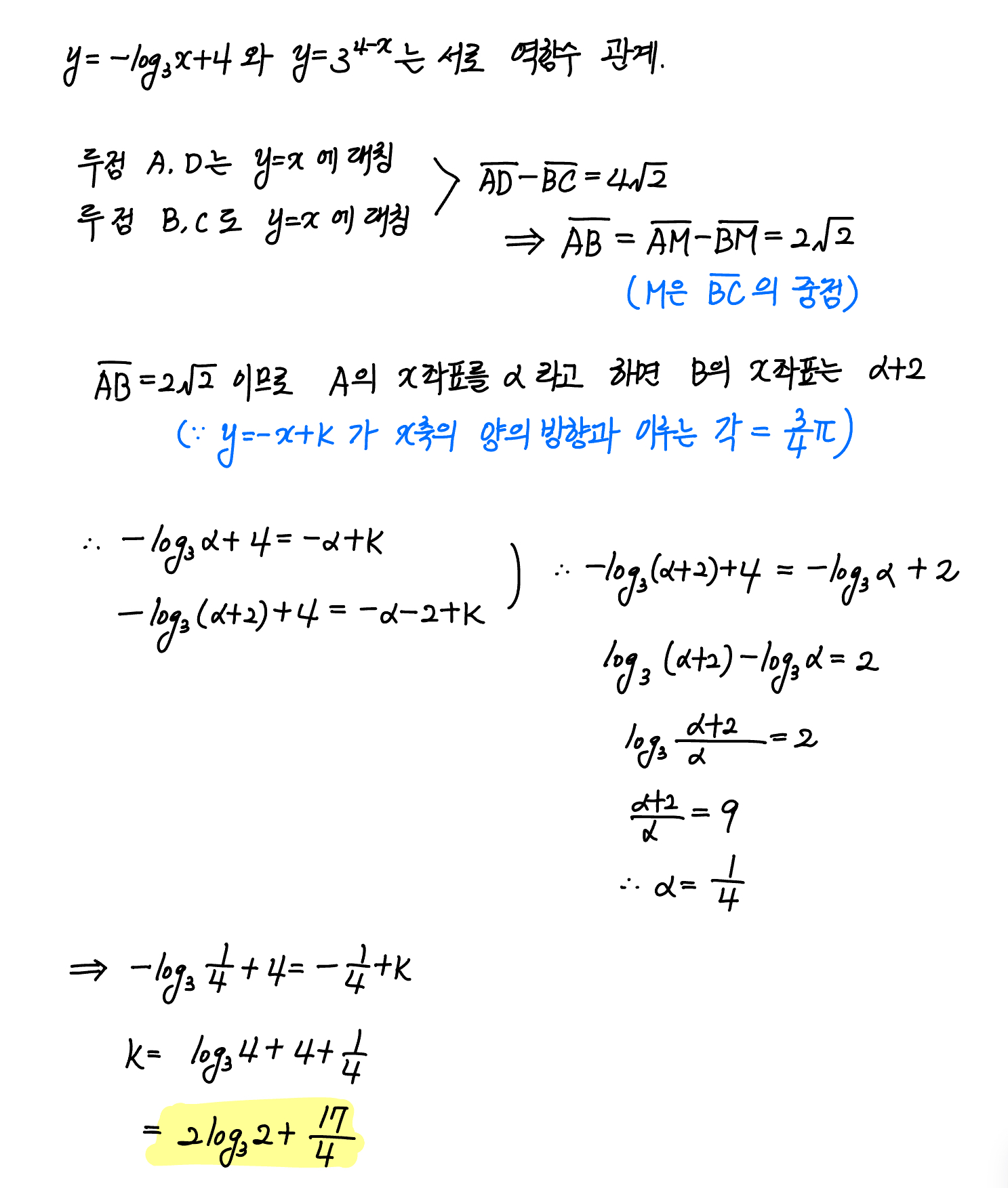 그림과 같이 상수 $k \; (5<k<6)$ 에 대하여 직선 $y=-x+k$ 가 두 곡선 $$y=-\log_3 x+4, \quad y=3^{-x+4}$$ 과 만나는 네 점을 $x$ 좌표가 작은 점부터 차례로 $\mathrm{A, \; B, \; C, \; D}$ 라 하자. $\overline{\mathrm{AD}}-\overline{\mathrm{BC}}=4\sqrt{2}$ 일 때, $k$ 의 값은?