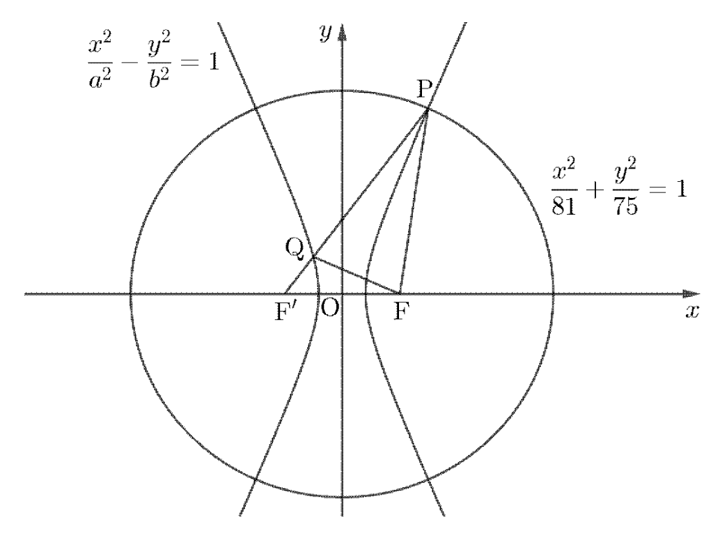 그림과 같이 두 점 $\mathrm{F}(c, \; 0)$, $\mathrm{F'}(-c, \; 0)$ $(c>0)$ 을 초점으로 하는 타원 $\dfrac{x^2}{81}+\dfrac{y^2}{75}=1$ 과 두 점 $\mathrm{F, \; F'}$ 를 초점으로 하는 쌍곡선 $\dfrac{x^2}{a^2}-\dfrac{y^2}{b^2}=1$ 이 있다. 타원과 쌍곡선이 만나는 점 중 제$1$사분면 위의 점을 $\mathrm{P}$ 라 하고, 선분 $\mathrm{F'P}$ 가 쌍곡선과 만나는 점 중 $\mathrm{P}$ 가 아닌 점을 $\mathrm{Q}$ 라 하자. 두 점 $\mathrm{P, \; Q}$ 가 다음 조건을 만족시킬 때, 점 $\mathrm{P}$ 의 $x$ 좌표는? (단, $a$ 와 $b$ 는 양수이다.)