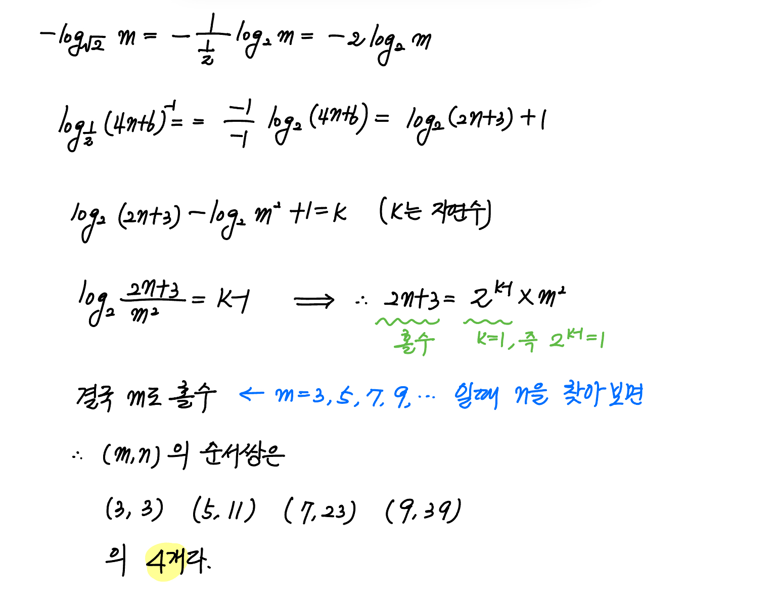 $40$ 이하의 두 자연수 $m, \; n$ 에 대하여 $$-\log_{\sqrt{2}}m+ \log_{\frac{1}{2}} (4n+6)^{-1}$$ 의 값이 자연수가 되도록 하는 모든 순서쌍 $(m, \; n)$ 의 개수는?