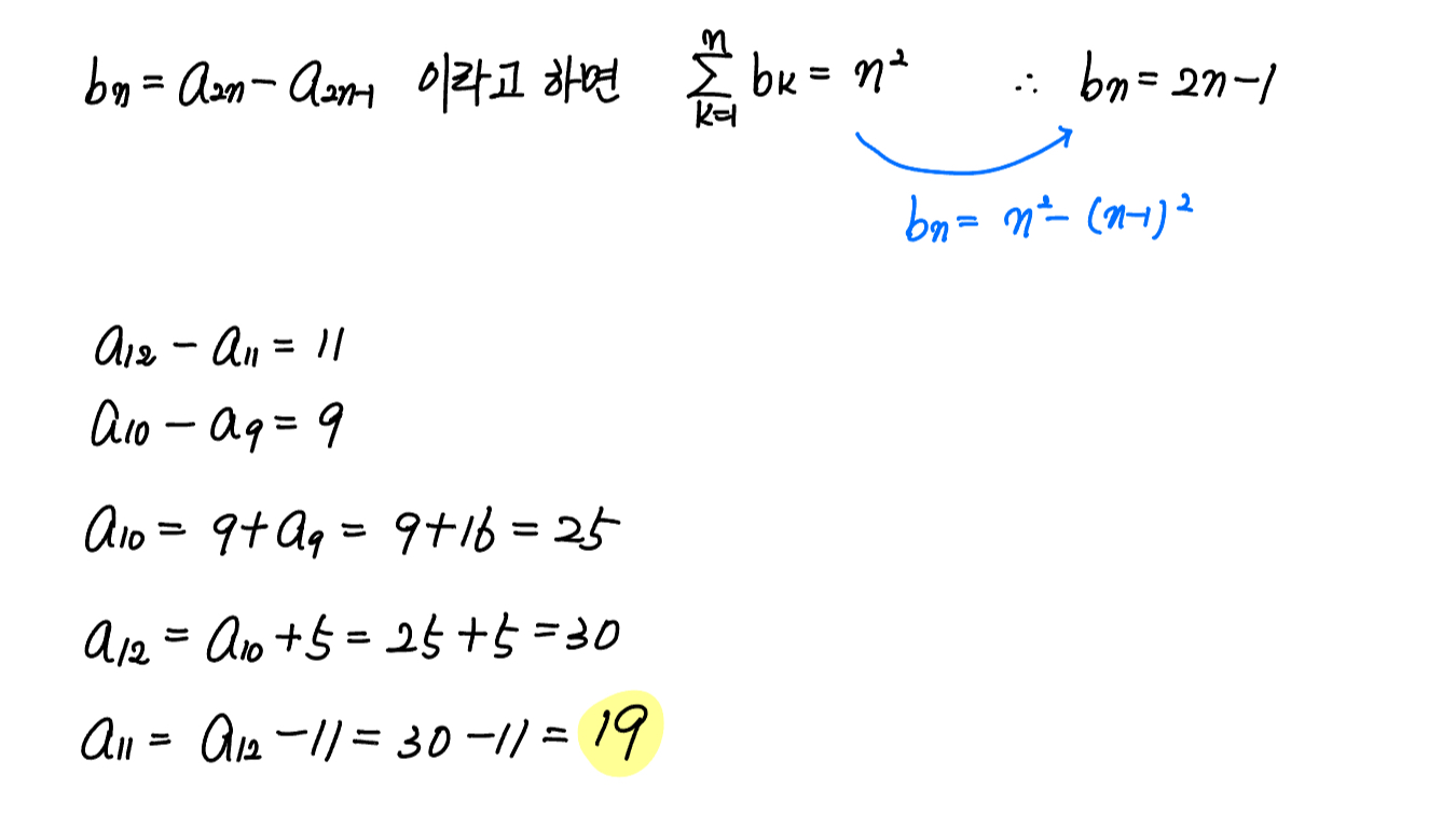 (나) 모든 자연수 $n$ 에 대하여 $\sum \limits_{k=1}^n a_{2k} = \sum \limits_{k=1}^n a_{2k-1}+n^2$ 이다.