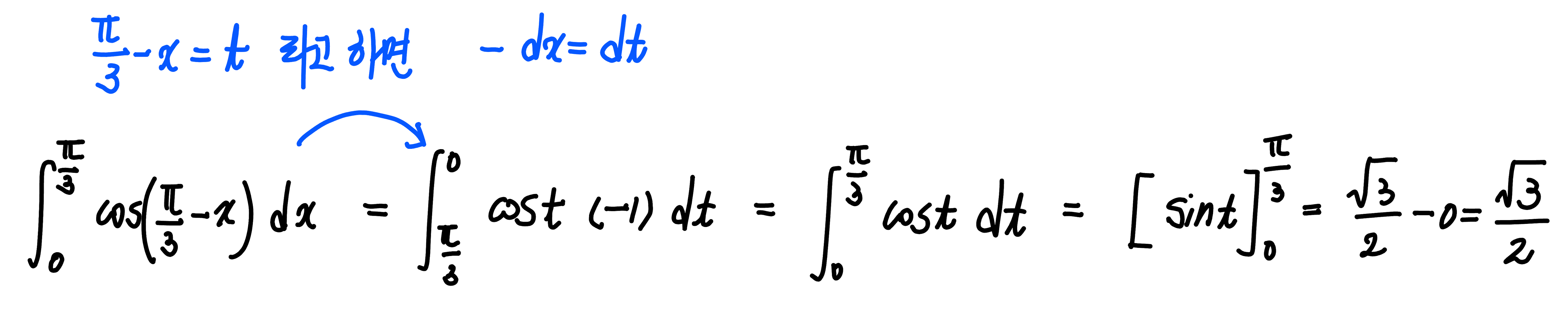 $\displaystyle \int_0^{\frac{\pi}{3}} \cos \left (\dfrac{\pi}{3}-x \right ) dx $ 의 값은?