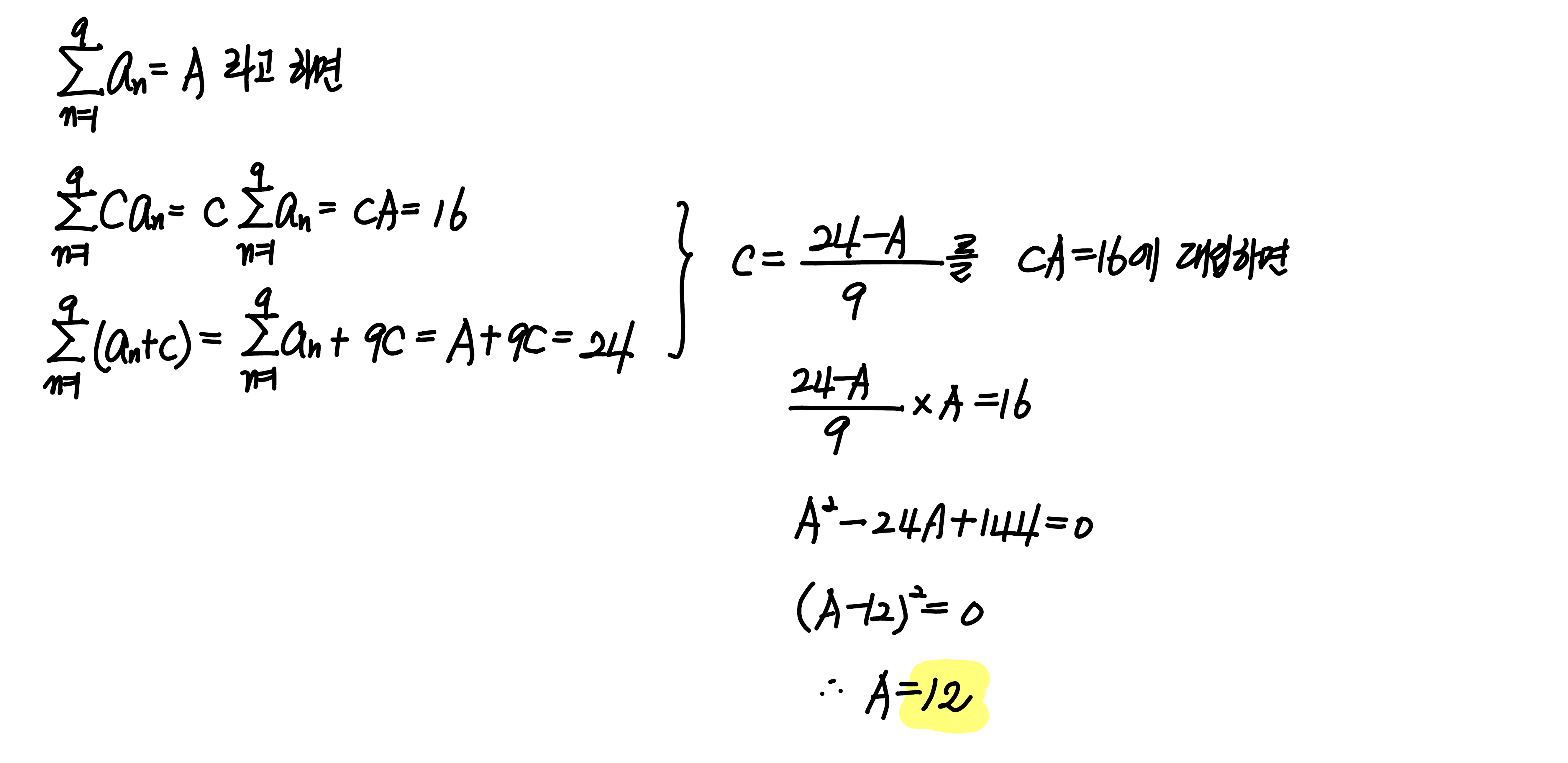 수열 $\{a_n\}$ 과 상수 $c$ 에 대하여 $$\sum \limits_{n=1}^9 c a_n = 16, \quad \sum \limits_{n=1}^9 (a_n +c)=24$$ 일 때, $\sum \limits_{n=1}^9 a_n$ 의 값을 구하시오.