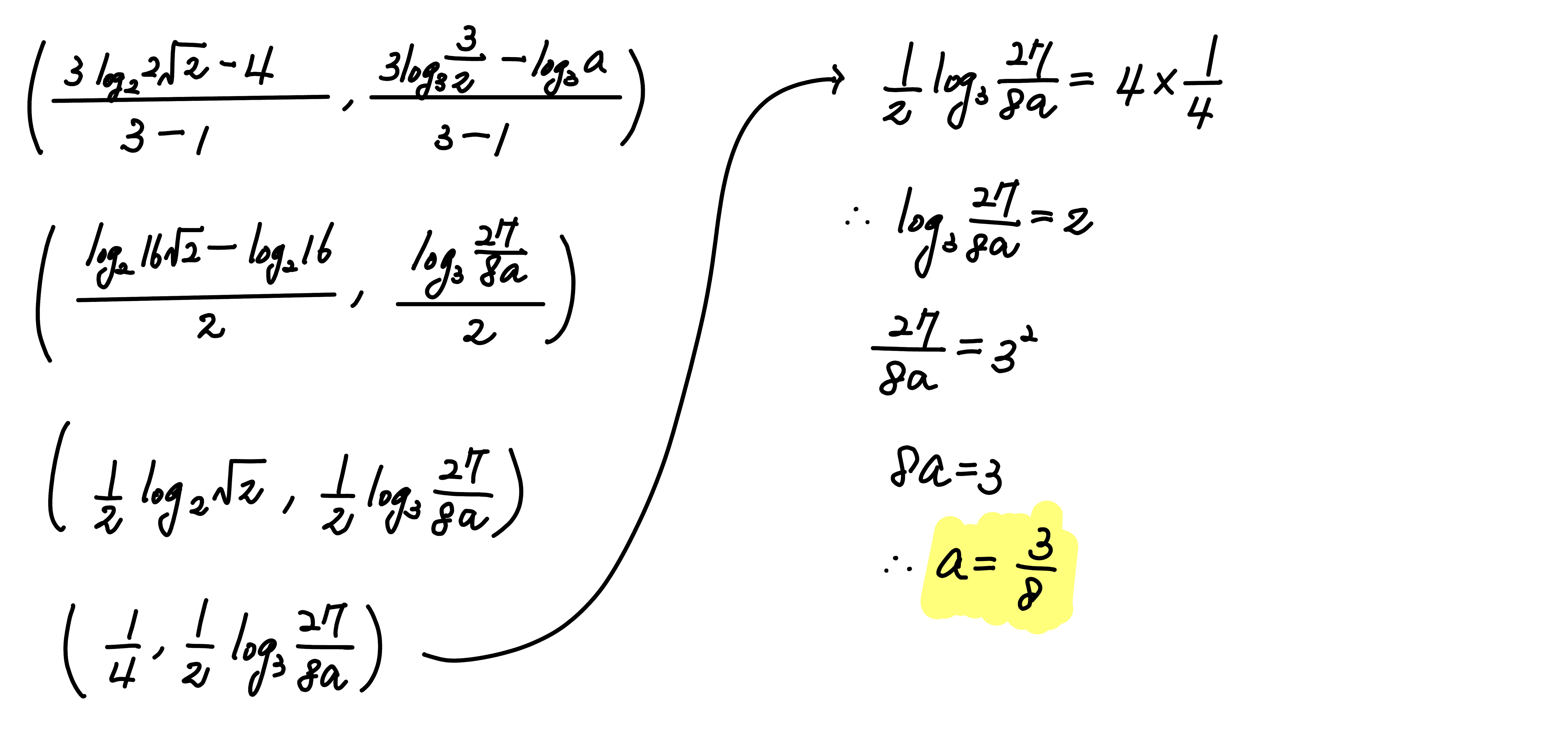 좌표평면 위에 두 점 $\mathrm{A}(4, \; \log_3 a)$, $\mathrm{B} \left (\log_2 2\sqrt{2}, \; \log_3 \dfrac{3}{2} \right )$ 이 있다. 선분 $\mathrm{AB}$ 를 $3:1$ 로 외분하는 점이 직선 $y=4x$ 위에 있을 때, 양수 $a$ 의 값은?