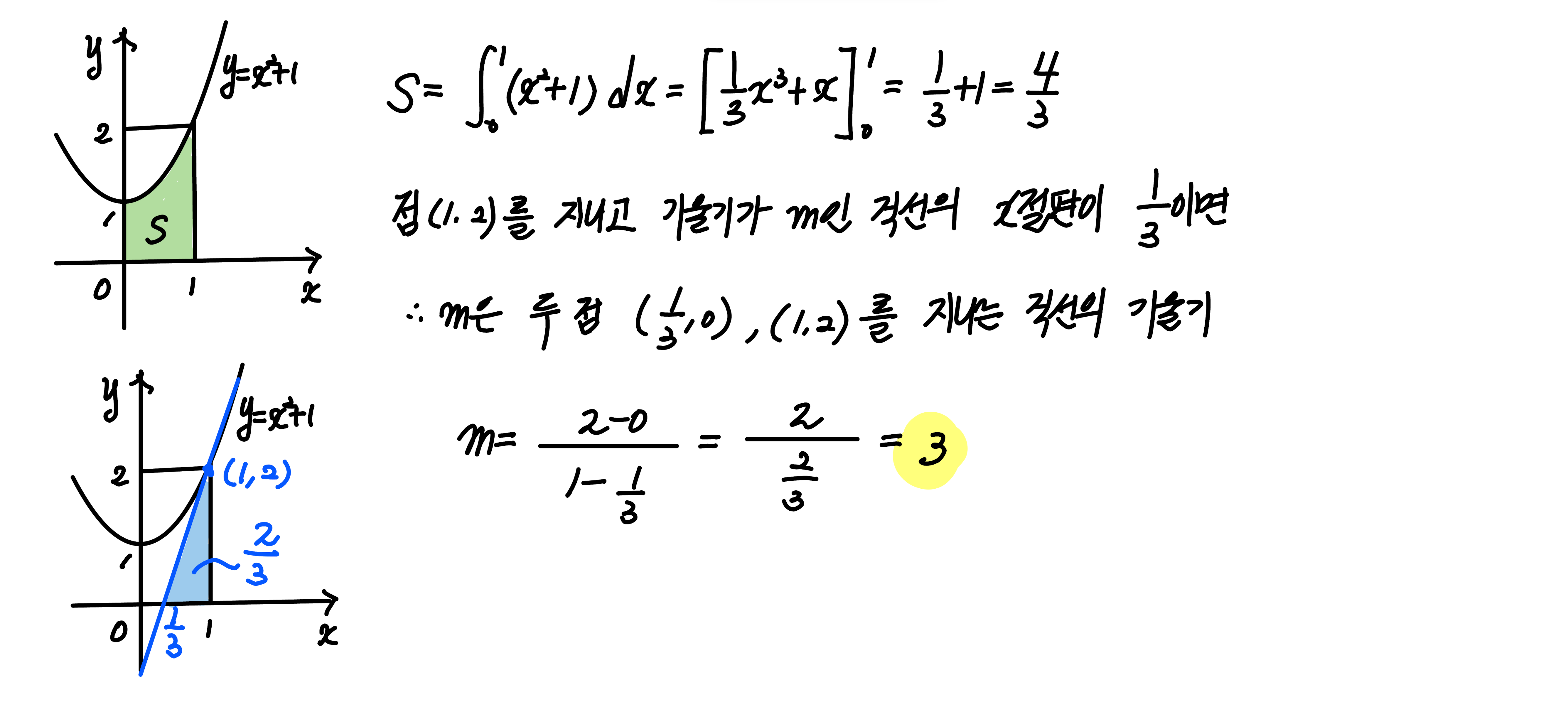 함수 $f(x)=x^2+1$ 의 그래프와 $x$ 축 및 두 직선 $x=0, \; x=1$ 로 둘러싸인 부분의 넓이를 점 $(1, \; f(1))$ 을 지나고 기울기가 $m \; (m \ge 2)$ 인 직선이 이등분할 때, 상수 $m$ 의 값은?