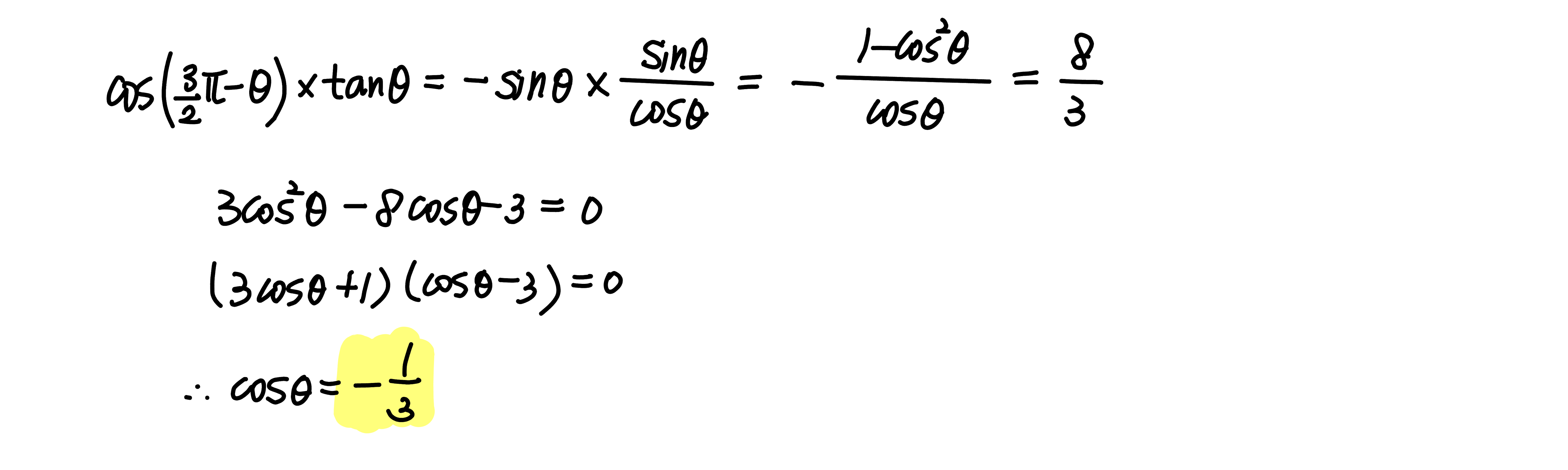 $\cos \left (\dfrac{3}{2}\pi - \theta \right ) \times \tan \theta = \dfrac{8}{3}$ 일 때, $\cos \theta$ 의 값은?