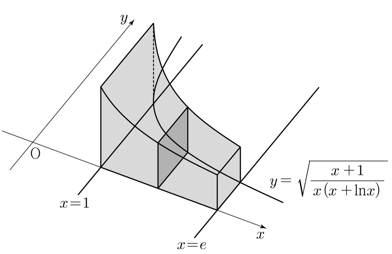 그림과 같이 곡선 $y=\sqrt{\dfrac{x+1}{x(x+\ln x)}}$ 과 $x$ 축 및 두 직선 $x=1, \; x=e$ 로 둘러싸인 부분을 밑면으로 하는 입체도형이 있다. 이 입체도형을 $x$ 축에 수직인 평면으로 자른 단면이 모두 정사각형일 때, 이 입체도형의 부피는?