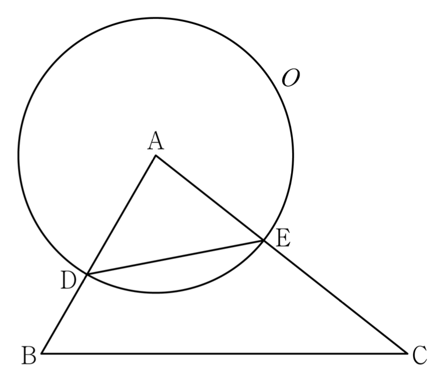 그림과 같이 삼각형 $\mathrm{ABC}$ 에서 선분 $\mathrm{AB}$ 위에 $\overline{\mathrm{AD}}:\overline{\mathrm{DB}}=3:2$ 인 점 $\mathrm{D}$ 를 잡고, 점 $\mathrm{A}$ 를 중심으로 하고 점 $\mathrm{D}$ 를 지나는 원을 $O$, 원 $O$ 와 선분 $\mathrm{AC}$ 가 만나는 점을 $\mathrm{E}$ 라 하자.