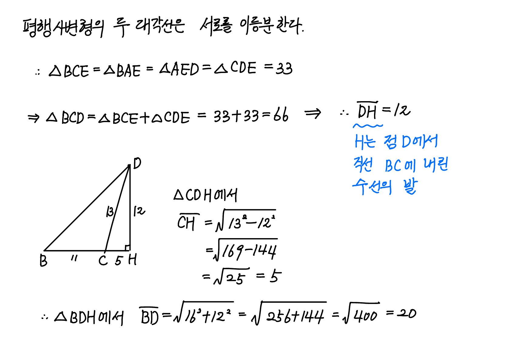 (중학과정) 평행사변형의 성질 & 피타고라스 정리_난이도 중 (2025년 3월 고1 12번)