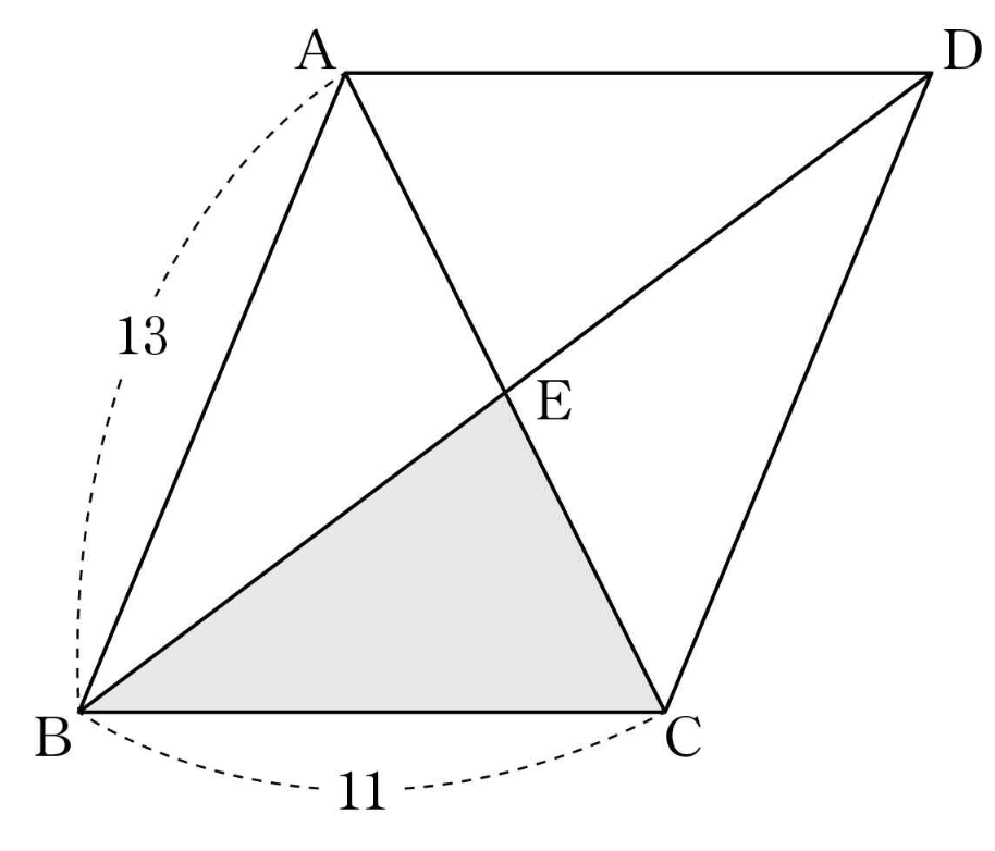 그림과 같이 $\overline{\mathrm{AB}}=13$, $\overline{\mathrm{BC}}=11$, $\angle \mathrm{CBA}<90^\circ$인 평행사변형 $\mathrm{ABCD}$의 두 대각선이 만나는 점을 $\mathrm{E}$라 하자. 삼각형 $\mathrm{BCE}$의 넓이가 $33$일 때, 선분 $\mathrm{BD}$의 길이는?