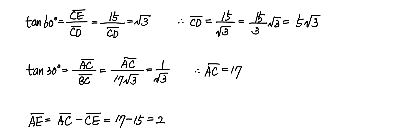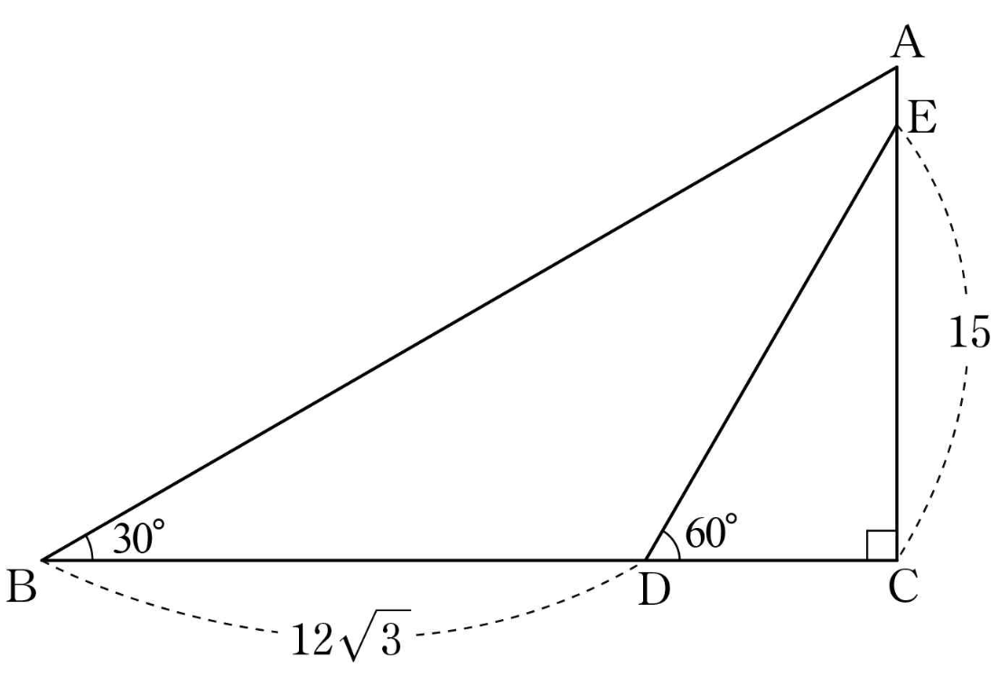 그림과 같이 $\angle \mathrm{B} = 30^\circ$, $\angle \mathrm{C} = 90^\circ$인 직각삼각형 $\mathrm{ABC}$가 있다. 선분 $\mathrm{BC}$ 위의 점 $\mathrm{D}$와 선분 $\mathrm{AC}$ 위의 점 $\mathrm{E}$에 대하여 $\mathrm{BD} = 12\sqrt{3}$, $\overline{\mathrm{CE}} = 15$, $\angle \mathrm{CDE} = 60^\circ $일 때, 선분 $\mathrm{AE}$의 길이는?