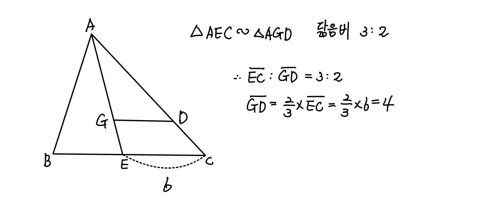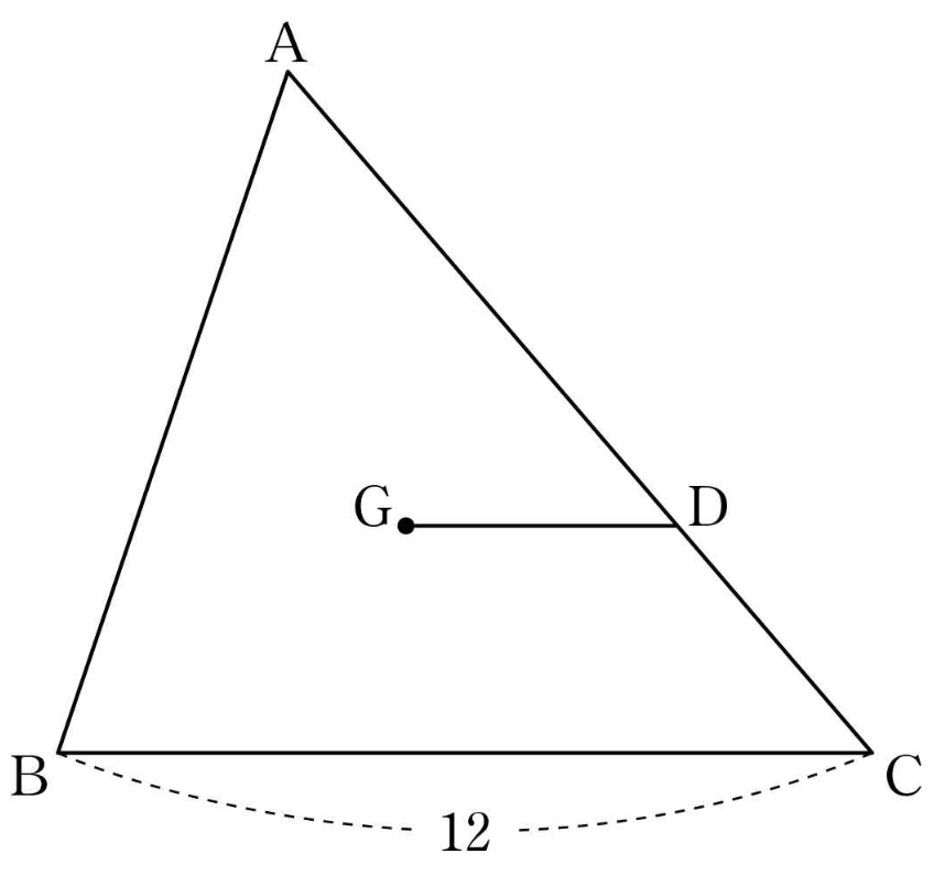 그림과 같이 $\overline{\mathrm{BC}}=12$인 삼각형 $\mathrm{ABC}$의 무게중심을 $\mathrm{G}$라 하자. 점 $\mathrm{G}$를 지나고 선분 $\mathrm{BC}$와 평행한 직선이 선분 $\mathrm{AC}$와 만나는 점을 $\mathrm{D}$라 할 때, 선분 $\mathrm{GD}$의 길이는?