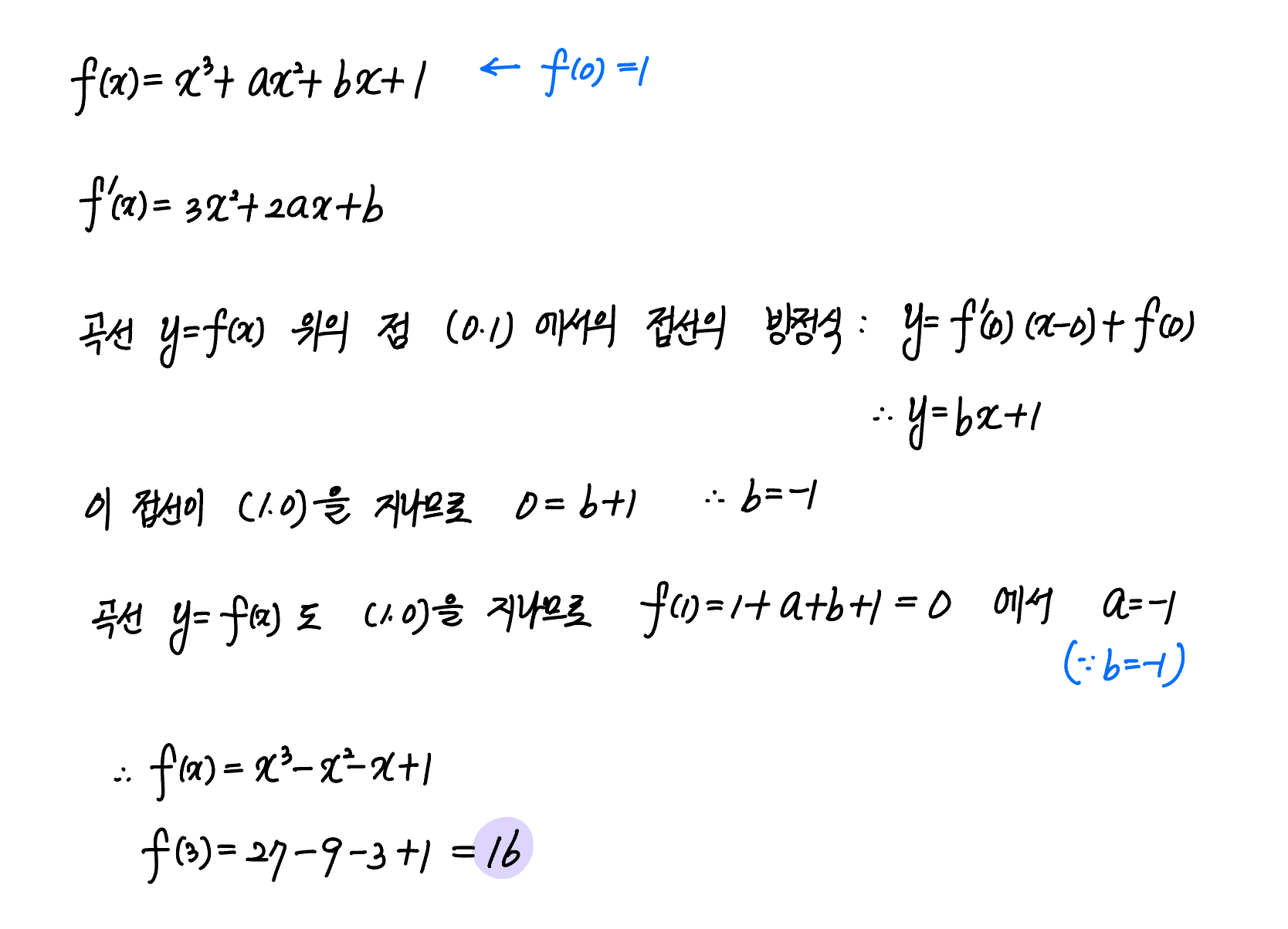 최고차항의 계수가 $1$인 삼차함수 $f(x)$에 대하여 곡선 $y=f(x)$ 위의 점 $(0,1)$에서의 접선이 곡선 $y=f(x)$와 점 $(1,0)$에서 만난다. $f(3)$의 값을 구하시오.