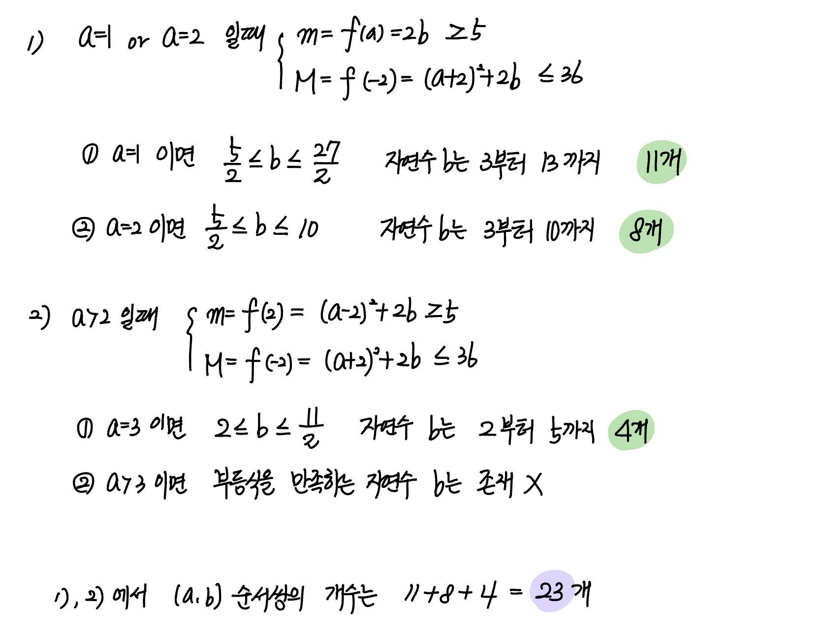 두 자연수 $a, \;b$에 대하여 $-2 \le x \le 2$에서 이차함수 $f(x)=(x-a)^2+2b$의 최댓값을 $M$, 최솟값을 $m$이라 하자. $M \le 36$이고 $m \ge 5$를 만족시키는 모든 순서쌍 $(a,\; b)$의 개수를 구하시오.