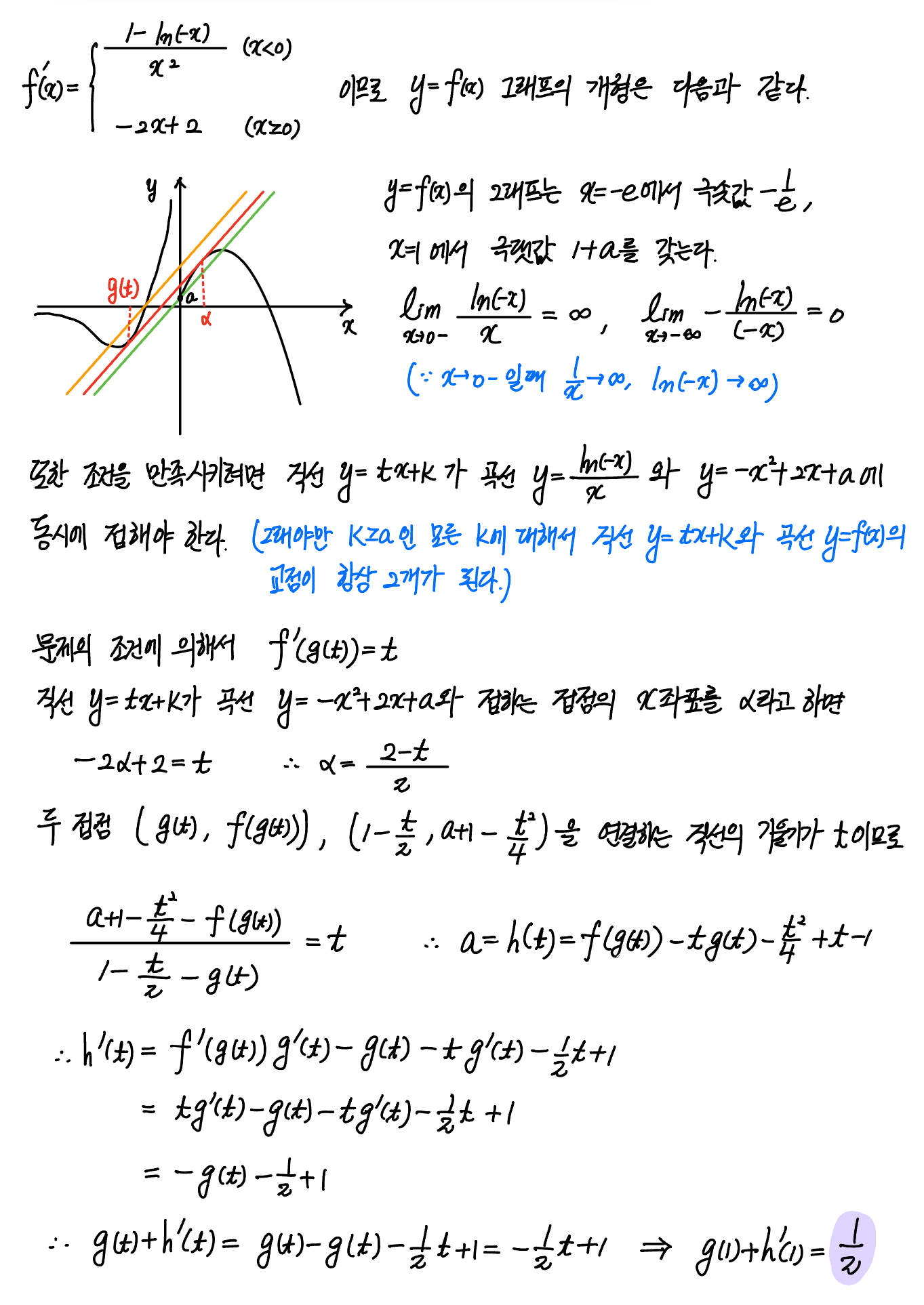 실수 $a$에 대하여 함수 $$f(x) = \begin{cases}\dfrac{\ln(-x)}{x} & (x < 0) \\[5pt] -x^2+2x+a & (x \ge 0)\end{cases}$$ 이다. 실수 $t$ ($0 < t < 2$)에 대하여 $f'(x)=t$를 만족시키는 음수 $x$의 값을 $g(t)$라 하고, 함수 $f(x)$가 다음 조건을 만족시키도록 하는 $a$의 값을 $h(t)$라 하자.