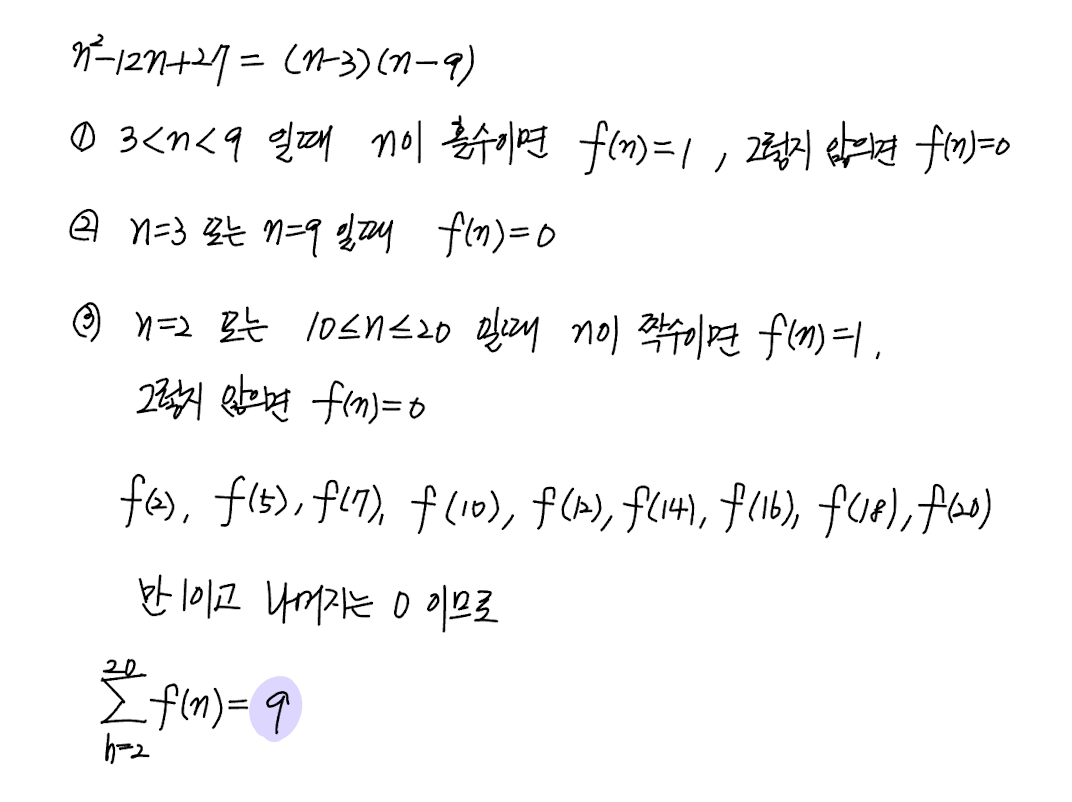 $2$ 이상의 자연수 $n$ 에 대하여 $n^2-12n+27$ 의 $n$ 제곱근 중 음의 실수인 것의 개수를 $f(n)$이라 할 때, $\displaystyle \sum_{n=2}^{20} f(n)$의 값은?