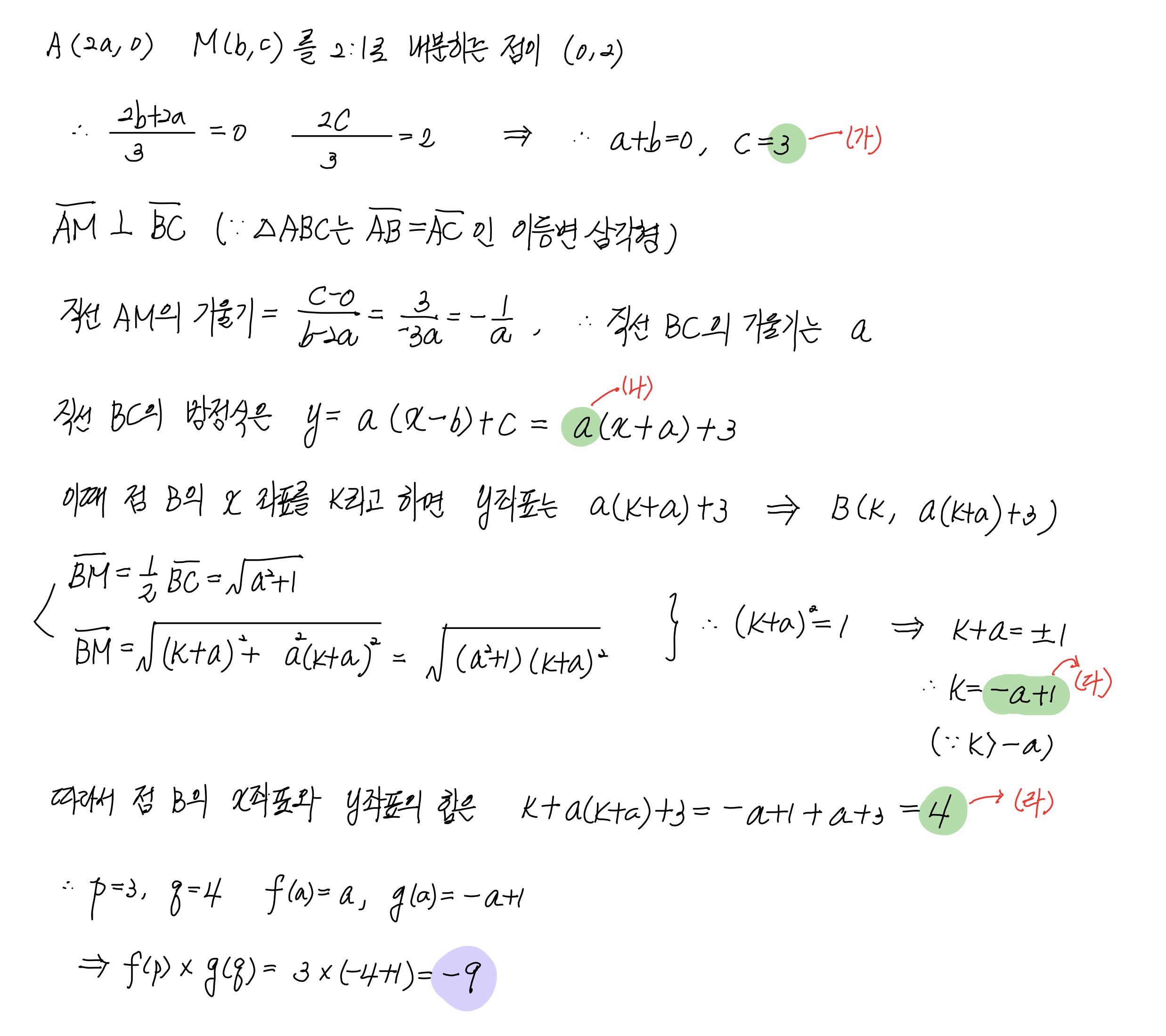 $\overline{\mathrm{AB}} = \overline{\mathrm{AC}}$이고 직선 $\mathrm{AM}$의 기울기가 $-\dfrac{1}{a}$이므로 직선 $\mathrm{BC}$의 방정식은 $$y = \boxed{\text{ (나) }} \times \{x -(- a)\} + \boxed{\text{ (가) }}$$ 이다.