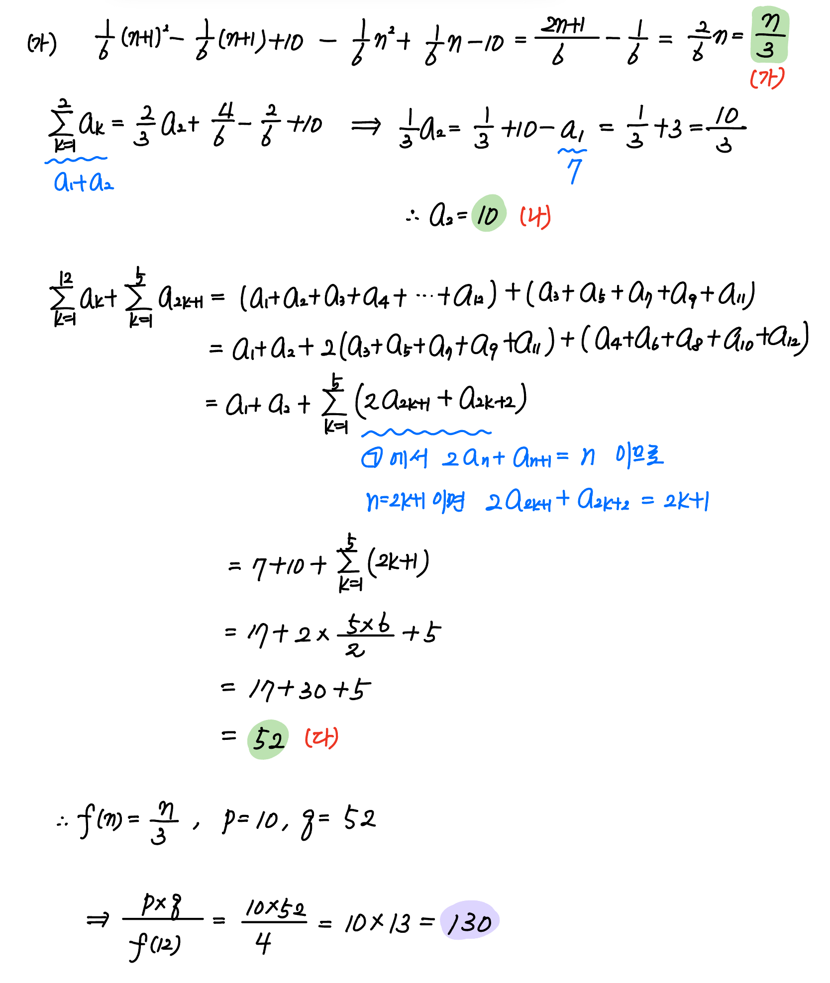$2$ 이상의 자연수 $n$ 에 대하여 $\displaystyle a_{n+1} = \sum_{k=1}^{n+1} a_k - \sum_{k=1}^n a_k$ 이므로$$a_{n+1} = \frac{2}{3} (a_{n+1} - a_n) + \boxed{\text{ (가) }}$$이고, 이 식을 정리하면$$2a_n + a_{n+1} = 3 \times \boxed{\text{ (가) }} \quad \quad \cdots \cdots ㉠$$이다.$$\displaystyle \sum_{k=1}^n a_k = \frac{2}{3} a_n + \frac{1}{6} n^2 - \frac{1}{6} n + 10 \quad (n \ge 2)$$에서 양변에 $n = 2$ 를 대입하면$$a_2 = \boxed{\text{ (나) }} \quad \quad \cdots \cdots ㉡$$이다. ㉠과 ㉡에 의하여 $$\begin{aligned}\displaystyle \sum_{k=1}^{12} a_k + \sum_{k=1}^5 a_{2k+1} &= a_1 + a_2 + \sum_{k=1}^5 (2a_{2k+1} + a_{2k+2}) \\[8pt] &=\boxed{\text{ (다) }}\end{aligned}$$ 이다.