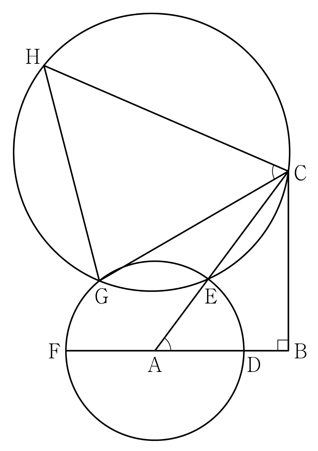 그림과 같이 $\overline{\mathrm{AB}}=3$, $\overline{\mathrm{BC}}=4$이고 $\angle \mathrm{B} = \dfrac{\pi}{2}$인 직각삼각형 $\mathrm{ABC}$가 있다. 선분 $\mathrm{AB}$를 $2:1$로 내분하는 점을 $\mathrm{D}$, 점 $\mathrm{A}$를 중심으로 하고 반지름의 길이가 $\overline{\mathrm{AD}}$인 원이 선분 $\mathrm{AC}$와 만나는 점을 $\mathrm{E}$, 직선 $\mathrm{AB}$가 이 원과 만나는 점 중 $\mathrm{D}$가 아닌 점을 $\mathrm{F}$라 하고, 호 $\mathrm{EF}$ 위의 점 $\mathrm{G}$를 $\overline{\mathrm{CG}} = 2\sqrt{6}$이 되도록 잡는다. 세 점 $\mathrm{C,\; E, \; G}$를 지나는 원 위의 점 $\mathrm{H}$가 $\angle \mathrm{HCG}=\angle \mathrm{BAC}$를만족시킬 때, 선분 $\overline{\mathrm{GH}}$의 길이는?