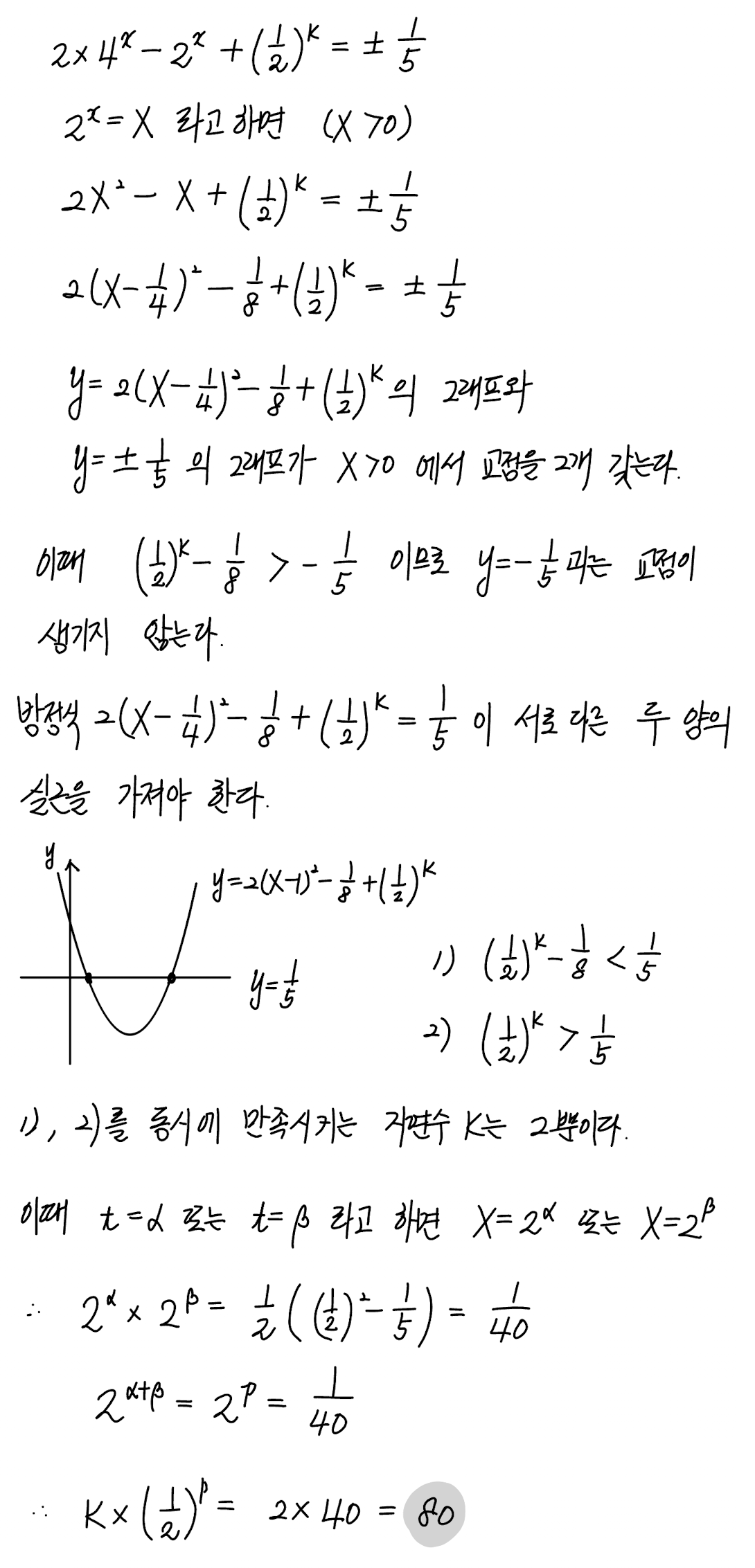 자연수 $k$ 에 대하여 두 함수 $f(x)=2^{x}, g(x)=2 \times 4^{x} + \left (\dfrac{1}{2} \right )^{k}$ 이 있다. 실수 $t$ 에 대하여 직선 $x=t$ 가 두 곡선 $y=f(x), y=g(x)$ 와 만나는 점을 각각 $\mathrm{A, \; B}$ 라 하자. 두 점 $\mathrm{A, \; B}$ 사이의 거리가 $\dfrac{1}{5}$ 이 되도록 하는 실수 $t$ 의 개수가 $2$ 이고 이 두 실수의 합을 $p$ 라 할 때, $k \times \left (\dfrac{1}{2} \right )^{p}$ 의 값을 구하시오.