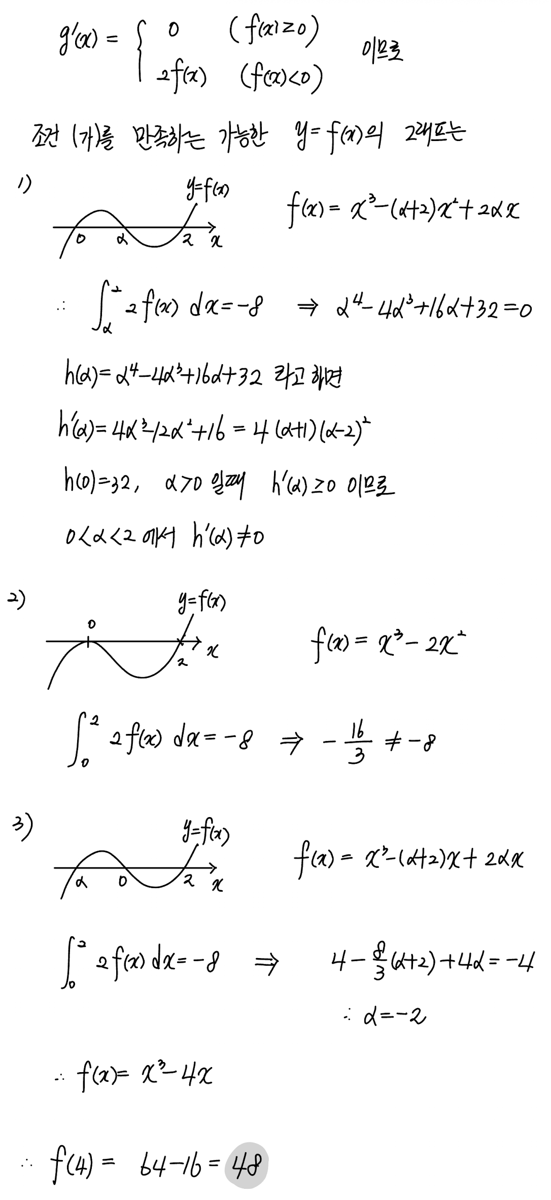 최고차항의 계수가 $1$ 이고 $f(0)=0$ 인 삼차함수 $f(x)$ 에 대하여 함수