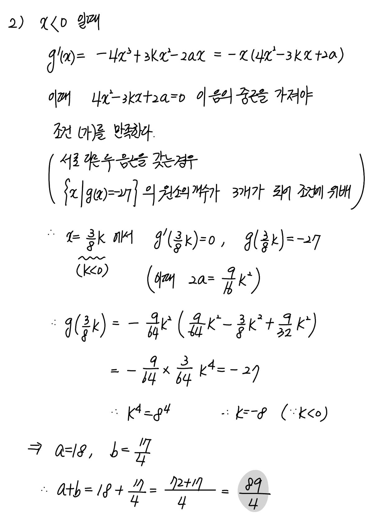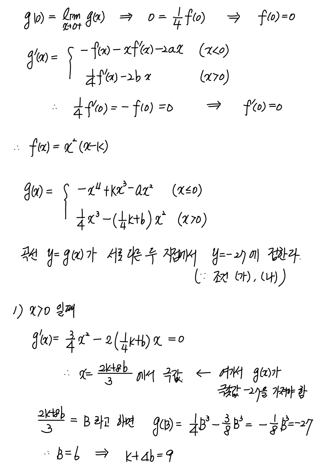 최고차항의 계수가 $1$ 인 삼차함수 $f(x)$ 와 두 상수 $a, b$ 에 대하여 함수 $$\mathrm{g}(x) = \begin{cases} -x f(x)-ax^{2} & (x \le 0) \\ \dfrac{1}{4} f(x)-bx^{2} & (x > 0) \end{cases}$$ 이 실수 전체의 집합에서 미분가능하다. 함수 $g(x)$ 가 다음 조건을 만족시킬 때, $a+b$ 의 값은?