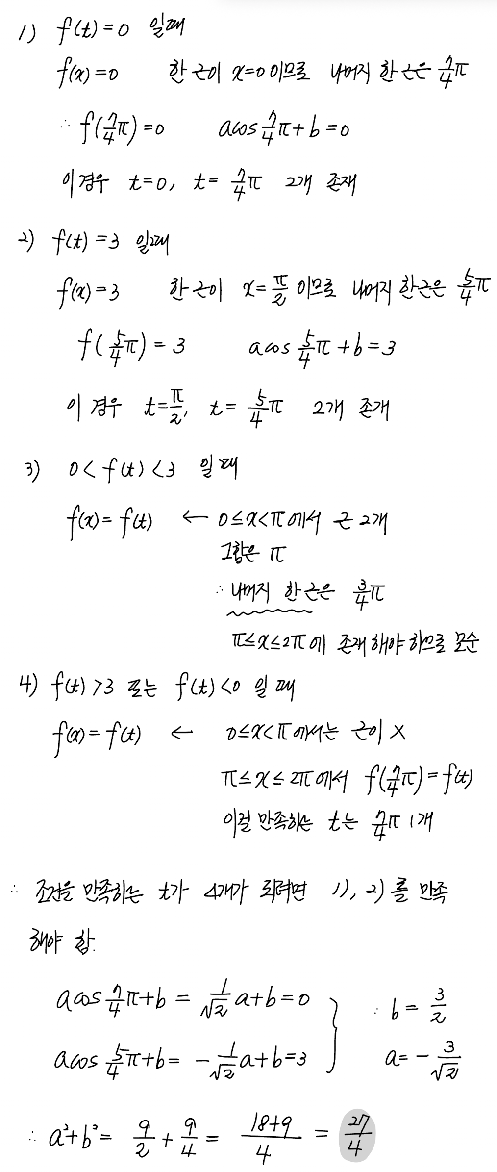 두 상수 $a$ ($a \ne 0$), $b$ 에 대하여 닫힌구간 $[0, 2\pi]$ 에서 정의된 함수 $$f(x) = \begin{cases} 3 \sin x & (0 \le x < \pi) \\ a \cos x + b & (\pi \le x \le 2\pi) \end{cases}$$ 가 있다. $0 \le t \le 2\pi$ 인 실수 $t$ 에 대하여 $x$ 에 대한 방정식 $f(x)=f(t)$ 를 만족시키는 모든 $x$ 의 값의 합이 $\dfrac{7}{4}\pi$ 가 되도록 하는 서로 다른 모든 실수 $t$ 의 개수가 $4$ 일 때, $a^{2}+b^{2}$ 의 값은?