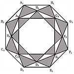 그림과 같이 한 변의 길이가 \(1\) 인 정팔각형 \(\rm A_1 B_1 C_1 D_1 E_1 F_1 G_1 H_1\) 의 내부에 정사각형 \(\rm A_1 C_1 E_1 G_1\) 과 \(\rm B_1 D_1 F_1 H_1\) 을 그리고 두 정사각형 \(\rm A_1 C_1 E_1 G_1\) 과 \(\rm B_1 D_1 F_1 H_1\) 의 변으로 둘러싸인 삼각형에 색칠하여 얻은 \(8\) 개의 삼각형을 \( T_1\) 이라 하고, 그 \(8\) 개의 삼각형의 넓이를 \(S_1\) 이라 하자. 또 두 정사각형 \(\rm A_1 C_1 E_1 G_1\) 과 \(\rm B_1 D_1 F_1 H_1\) 의 변의 교점을 \(\rm A_2 , \; B_2 ,\; C_2 , \; D_2 , \; E_2 ,\;..