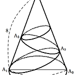 그림과 같이 모선 \(\rm OA_1\) 의 길이가 \(8\), 밑면의 지름 \(\rm A_0 A_1\) 의 길이가 \(4\) 인 원뿔이 있다. 점 \(\rm A_1\) 을 출발하여 원뿔을 한 바퀴 돌아 다시 점 \(\rm A_1\) 으로 돌아오는 최단 경로의 길이를 \(l_1\) 이라 하고, 이 최단 경로와 모선 \(\rm OA_0\) 가 만나는 점을 \(\rm A_2\) 라 하자. 또, 점 \(\rm A_2\) 를 출발하여 원뿔을 한 바퀴 돌아 다시 점 \(\rm A_2\) 로 돌아오는 최단 경로의 길이를 \(l_2\) 라 하고, 이 최단 경로와 모선 \(\rm OA_1\) 이 만나는 점을 \(\rm A_3\) 이라 하자. 이와 같은 과정을 계속하여 \(n\) 번째 얻은 최단 경로의 길이를 \(l_n..