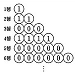그림과 같이 \(1\) 행에는 \(1\) 개, \(2\) 행에는 \(2\) 개, \(\cdots\), \(n\) 행에는 \(n\) 개의 원을 나열하고 그 안에 다음 규칙에 따라 \(0\) 또는 \(1\) 을 써 넣는다. (가) \(1\) 행의 원 안에는 \(1\) 을 써 넣는다. (나) \(n \le 2\) 일 때, \(1\) 행부터 \((n-1)\) 행까지 나열된 모든 원 안의 수의 합이 \(n\) 이상이면 \(n\) 행에 나열된 모든 원 안에 \(0\) 을 써 넣고, \(n\) 미만이면 \(n\) 행에 나열된 모든 원 안에 \(1\) 을 써 넣는다. \(1\) 행부터 \(32\) 행까지 나열된 워 안에 써 넣은 모든 수의 합을 구하시오. 정답 63