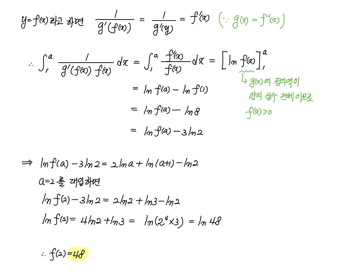 양의 실수 전체의 집합에서 정의되고 미분가능한 두 함수 $f(x), \; g(x)$ 가 있다. $g(x)$ 는 $f(x)$ 의 역함수이고, $g'(x)$ 는 양의 실수 전체의 집합에서 연속이다.